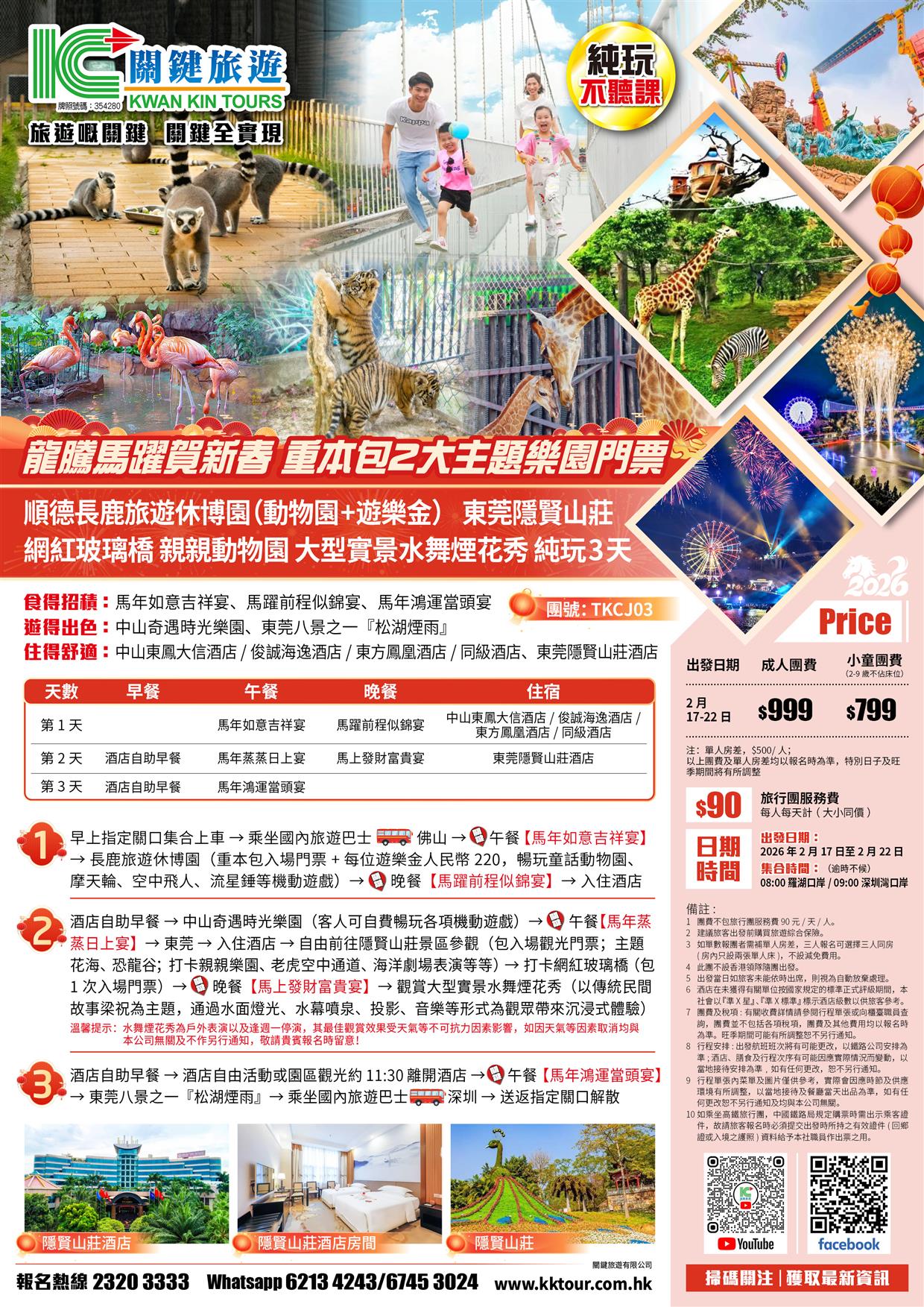 (春節加班)順德長鹿旅遊休博園、東莞隱賢山莊(主题花海 網紅玻璃橋 親親動物園)水舞煙花秀純玩3天