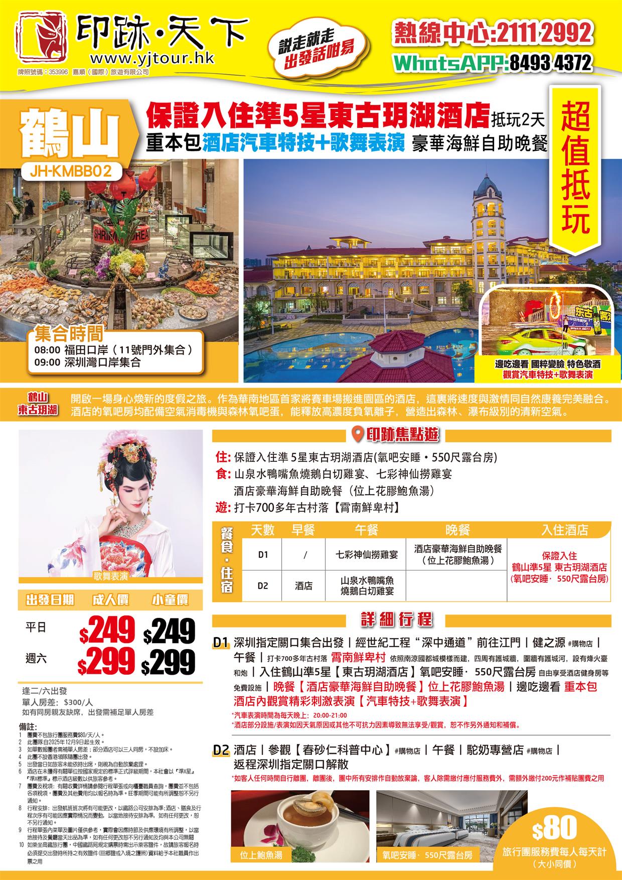鶴山 保證入住5星標準東古玥湖酒店 嘆 豪華海鮮自助晚餐 重本包酒店內【汽車特技+歌舞表演】抵玩2天