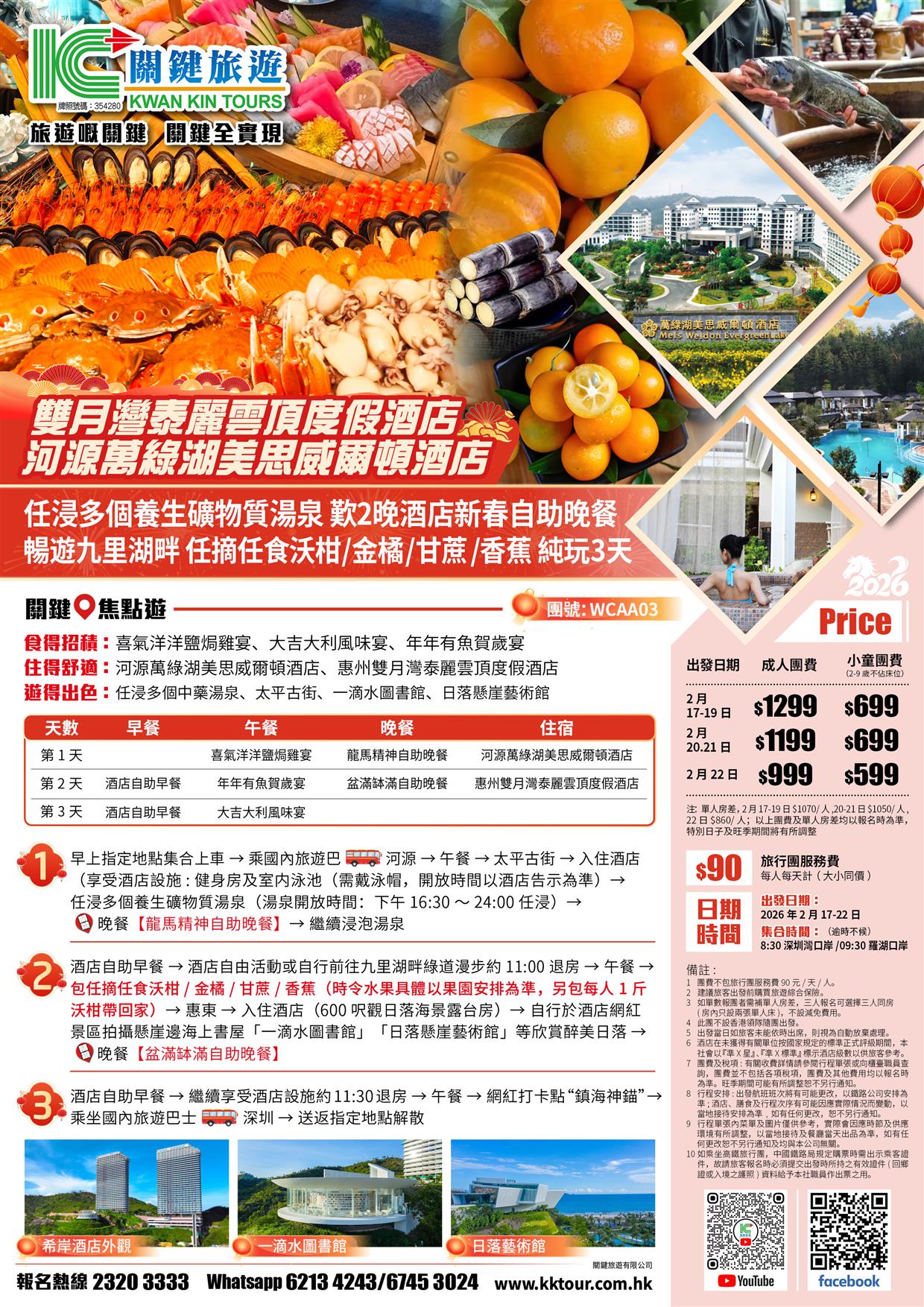 (春節加班)河源萬綠湖美思威爾頓酒店+雙月灣泰麗雲頂度假酒店 歎2晚酒店自助晚餐 純玩3天