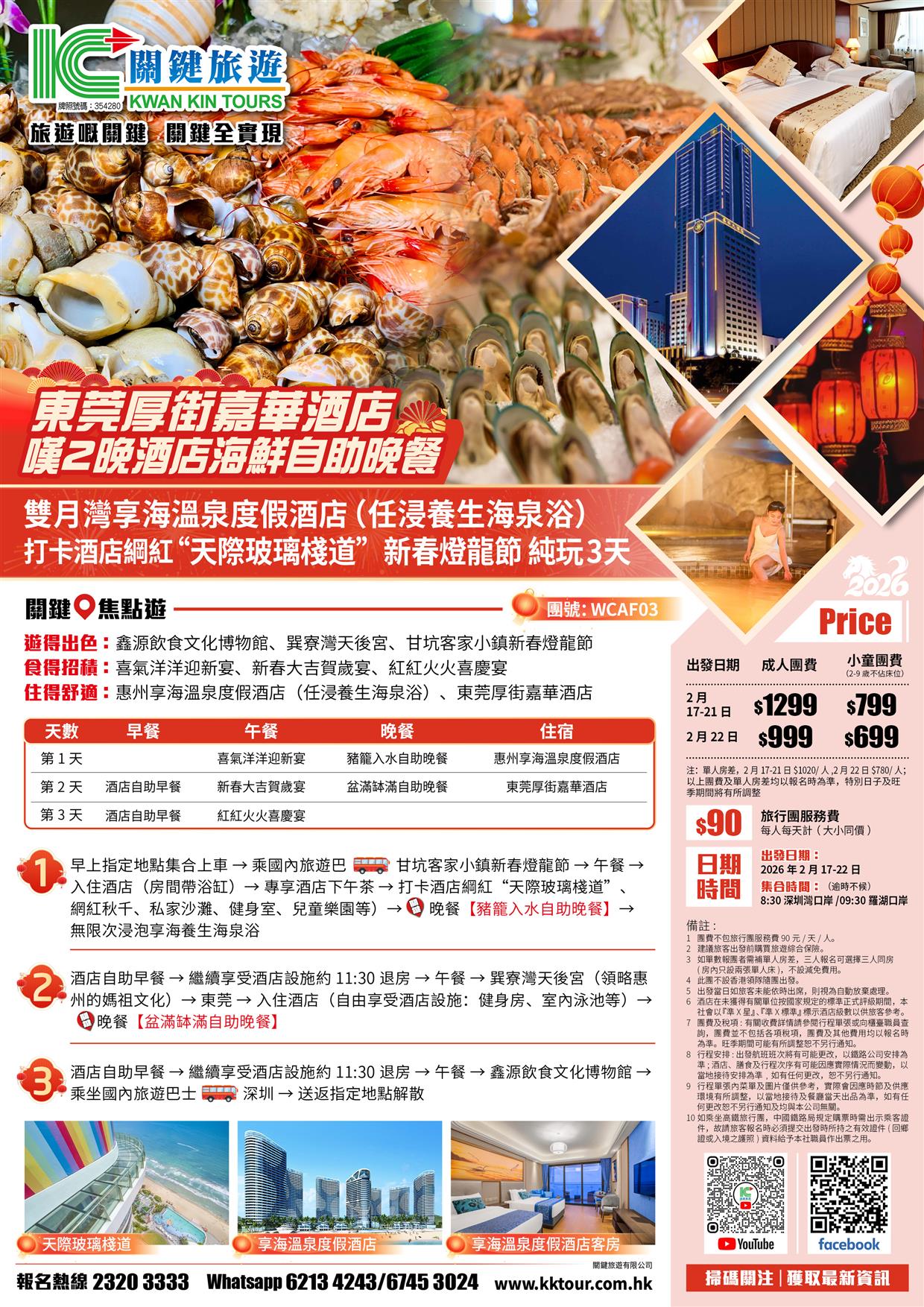 (春節加班)東莞厚街嘉華酒店+雙月灣享海溫泉度假酒店(任浸養生海泉)嘆2晚酒店海鮮自助晚餐 純玩3天