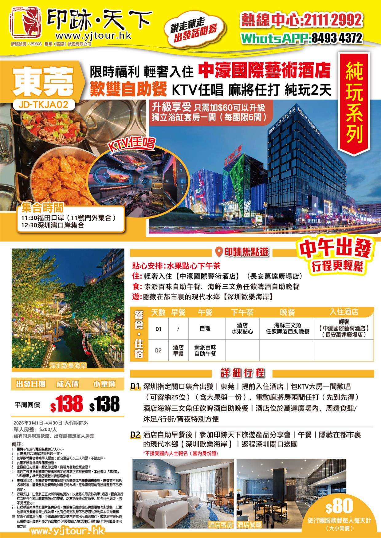 會員專享 東莞 輕奢入住【中濠國際藝術酒店】歎雙自助餐 KTV任唱 麻將任打 純玩2天