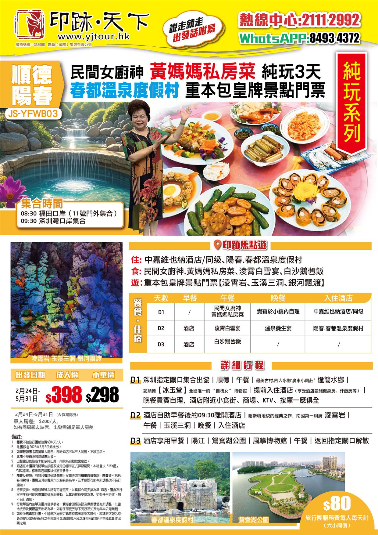 陽春 黃媽媽私房菜 重本包皇牌景點門票【淩霄岩、玉溪三洞、銀河飄渡】入住陽春.春都溫泉度假村純玩3天