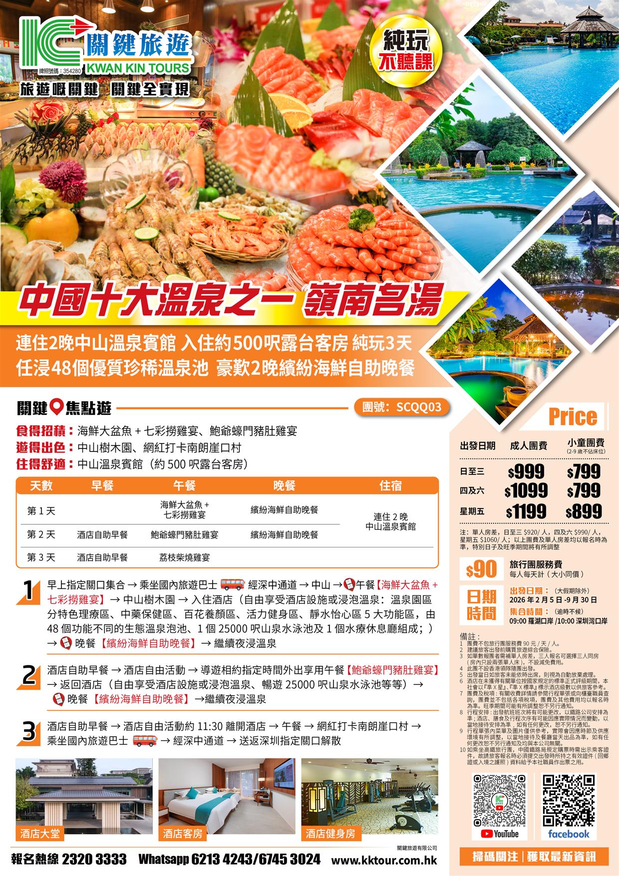 連住2晚中山溫泉賓館(入住約500呎露台客房)、任浸48個優質珍稀溫、歎2晚繽紛海鮮自助晚餐純玩3天