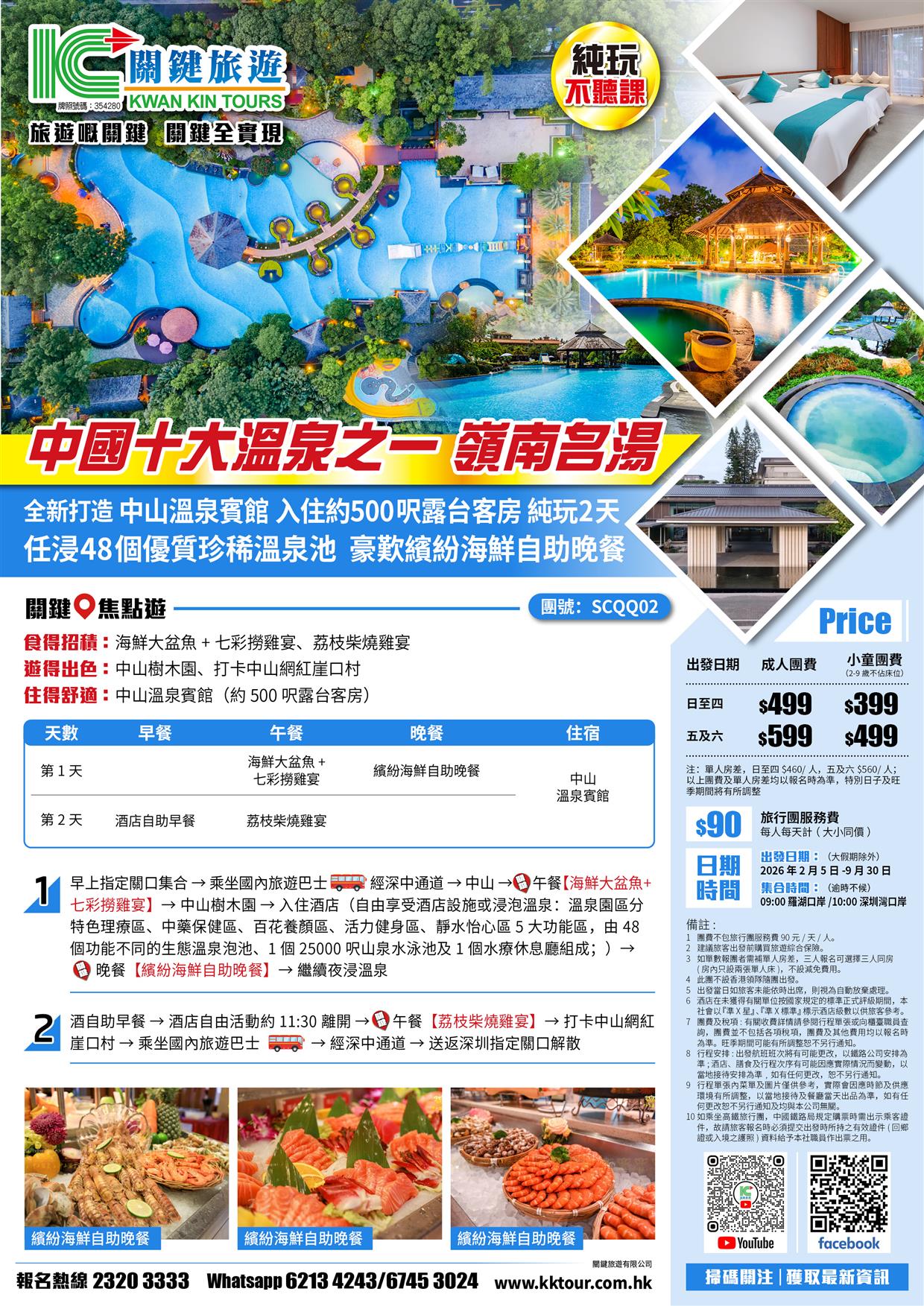 全新打造中山溫泉賓館(入住約500呎露台客房) 任浸48個優質珍稀溫泉池、歎繽紛海鮮自助晚餐純玩2天