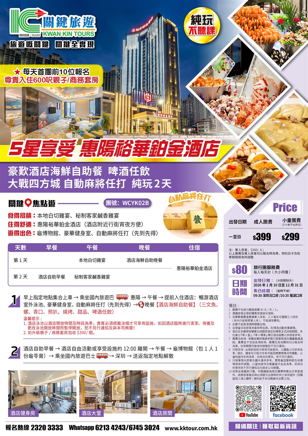 (B線-首團頭10位提升親子/商務套房)惠陽裕華鉑金酒店(豪歎酒店海鮮自助餐)純玩2天