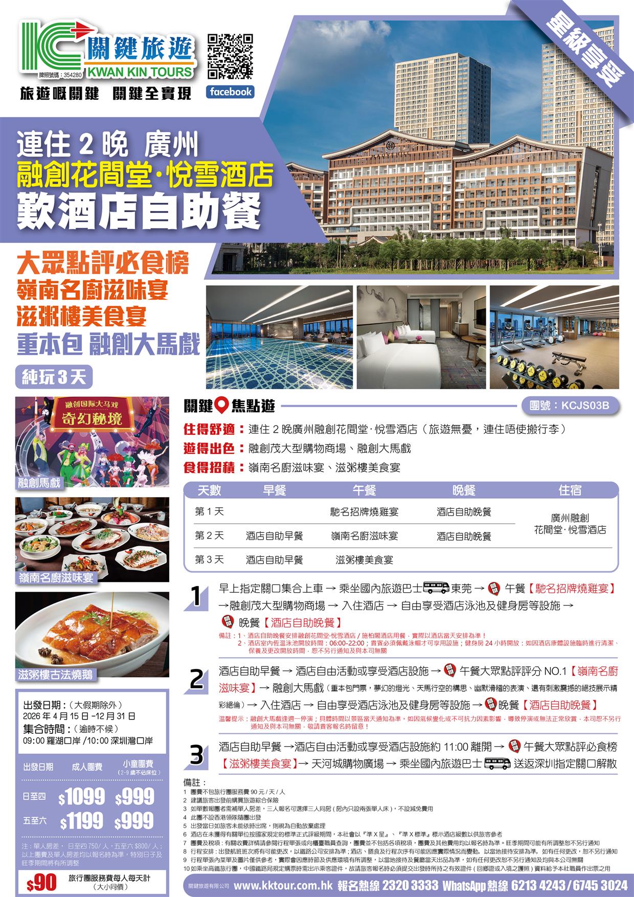 B線-連住2晚廣州融創花間堂·悅雪酒店(原堇山酒店) 歎酒店自助餐 嶺南名廚滋味宴&滋粥樓純玩3天
