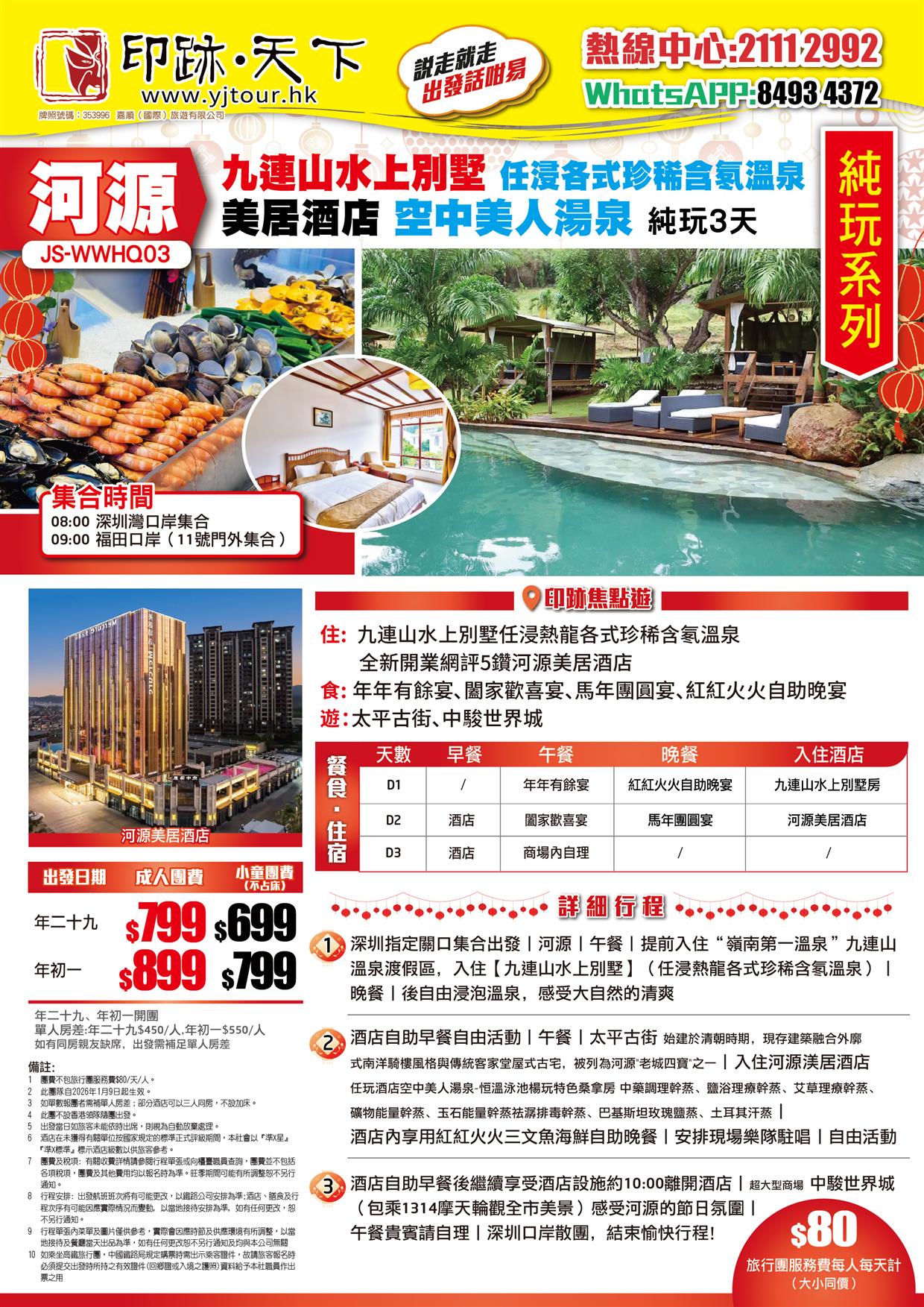河源迎新春 入住九連山水上別墅-任浸各式珍稀含氡溫泉 美居酒店歎紅火海鮮自助餐-空中美人湯泉純玩3天