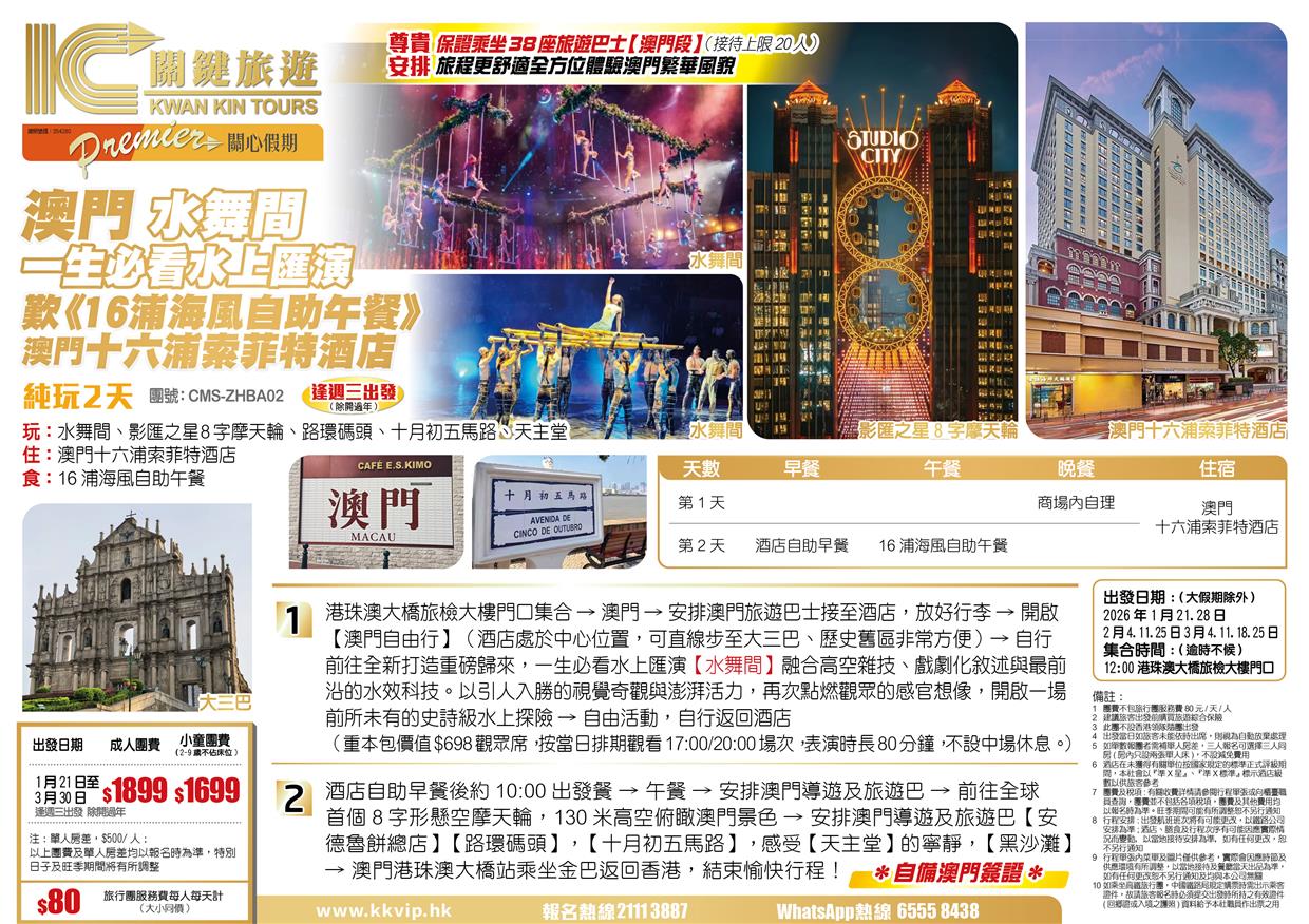 澳门 一生必看水上匯演【水舞間】 歎《16浦海風自助午餐》 入住澳門十六浦索菲特酒店 純玩2天
