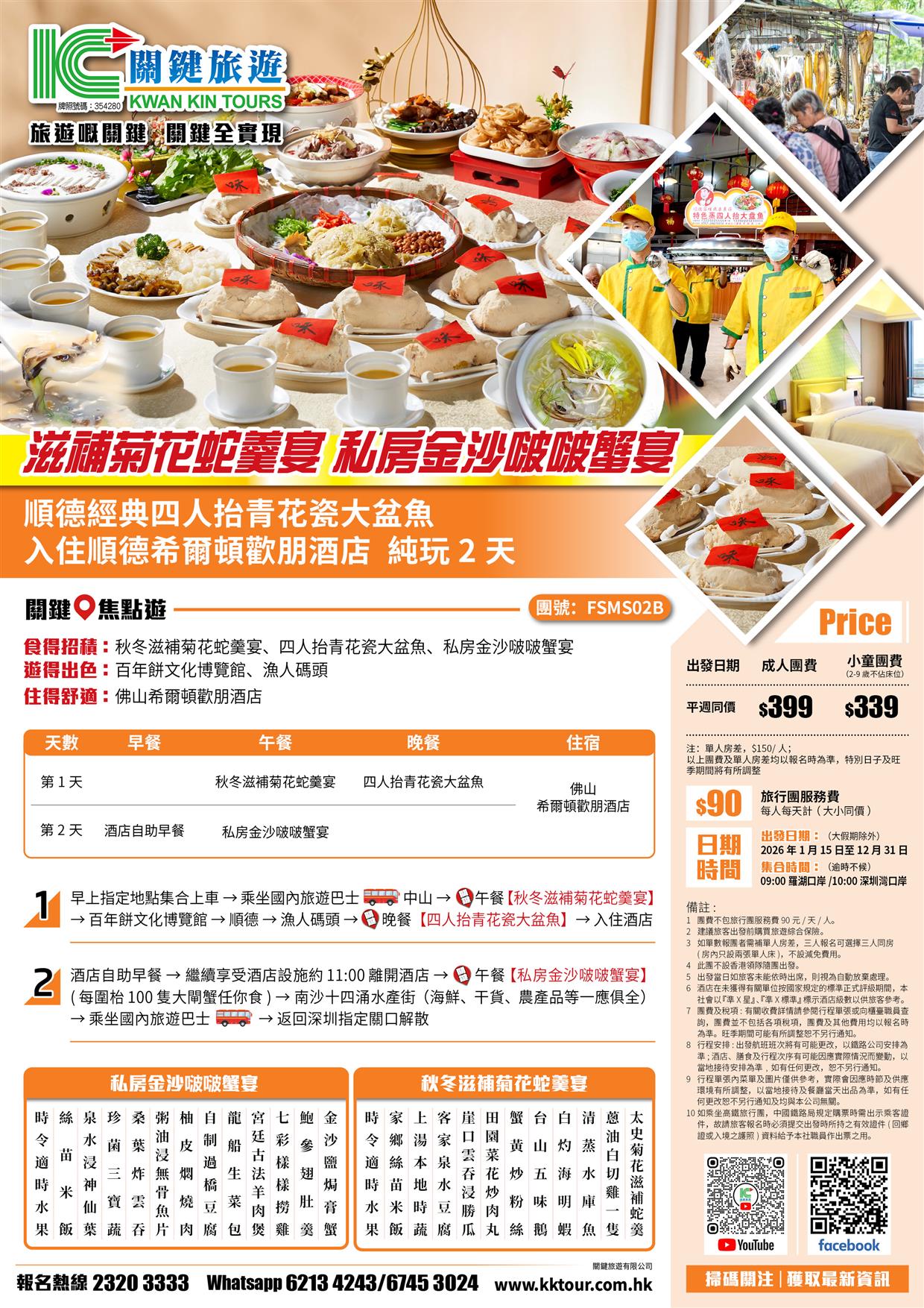 B線-滋補菊花蛇羹宴、金沙焗膏蟹 四人抬青花瓷大盆魚 中山順德美食純玩2天