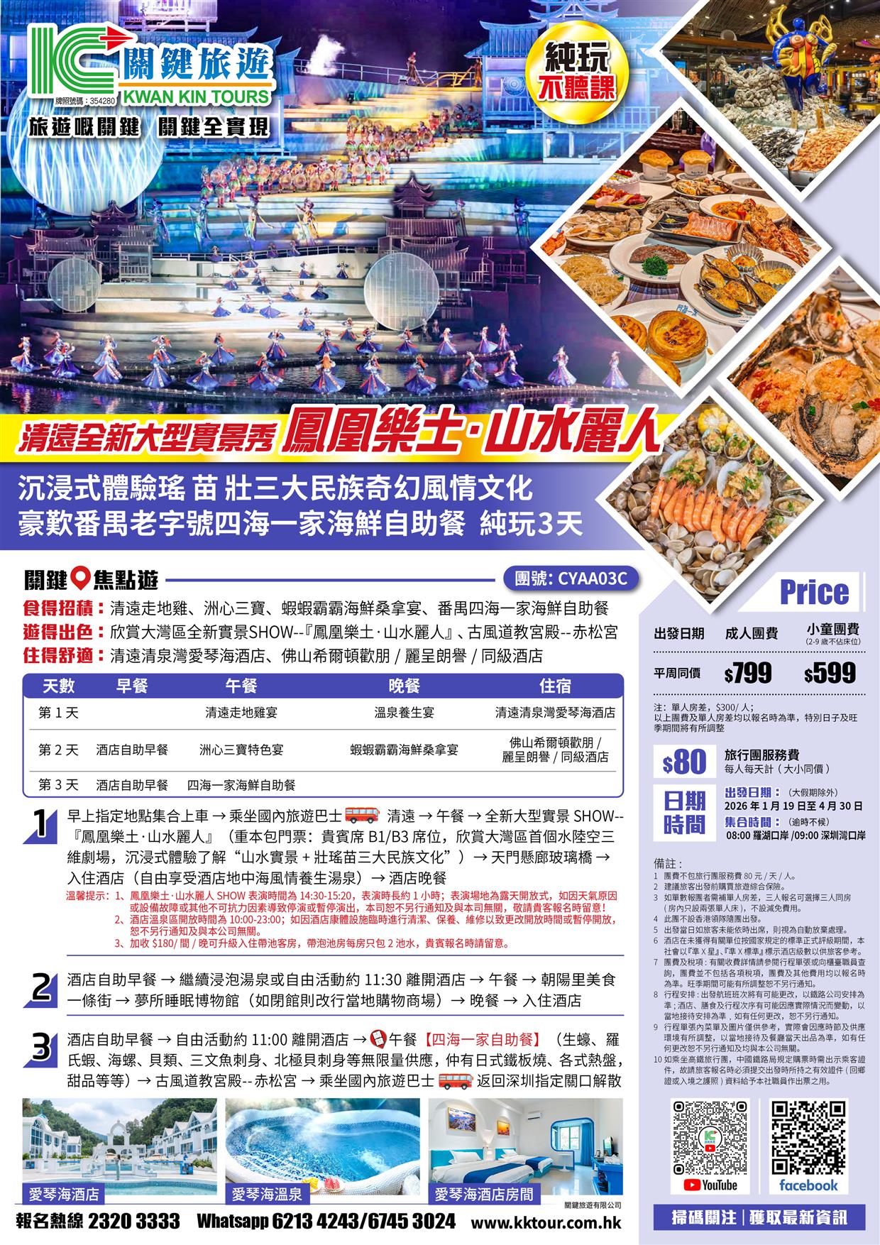 C線-清遠全新大型實景秀--《鳳凰樂土·山水麗人》 四海一家海鮮自助餐 純玩3天