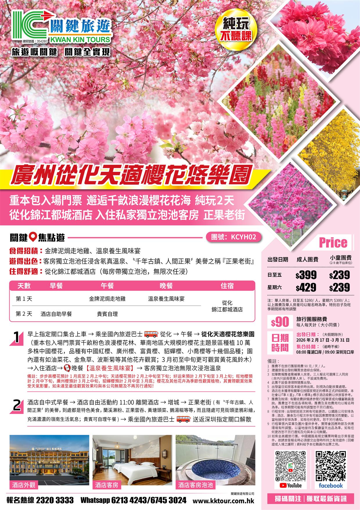 從化天適櫻花悠樂園、從化錦江都城酒店(入住私家獨立泡池客房)、正果老街純玩2天