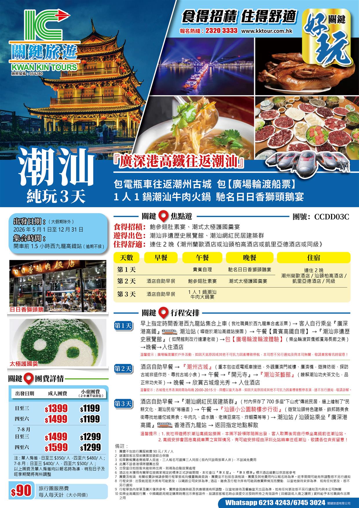 C線-西九龍高鐵往返潮汕 1人1鍋潮汕牛肉火鍋、馳名日日香獅頭鵝宴 純玩3天