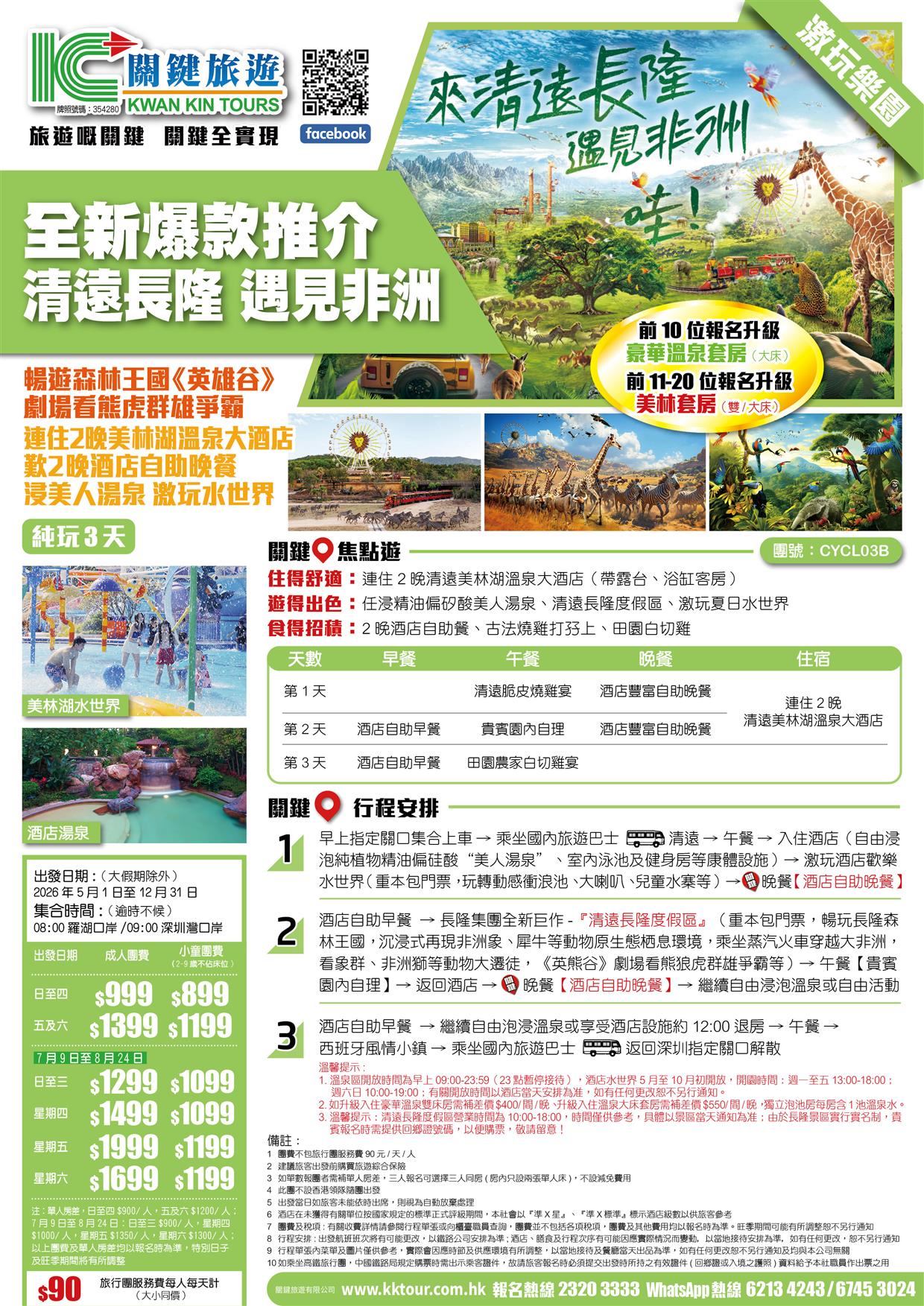 B線-清遠長隆森林王國 連住2晚清遠美林湖溫泉酒店 激玩水世界 任浸美人湯泉 歎酒店自助餐 純玩3天