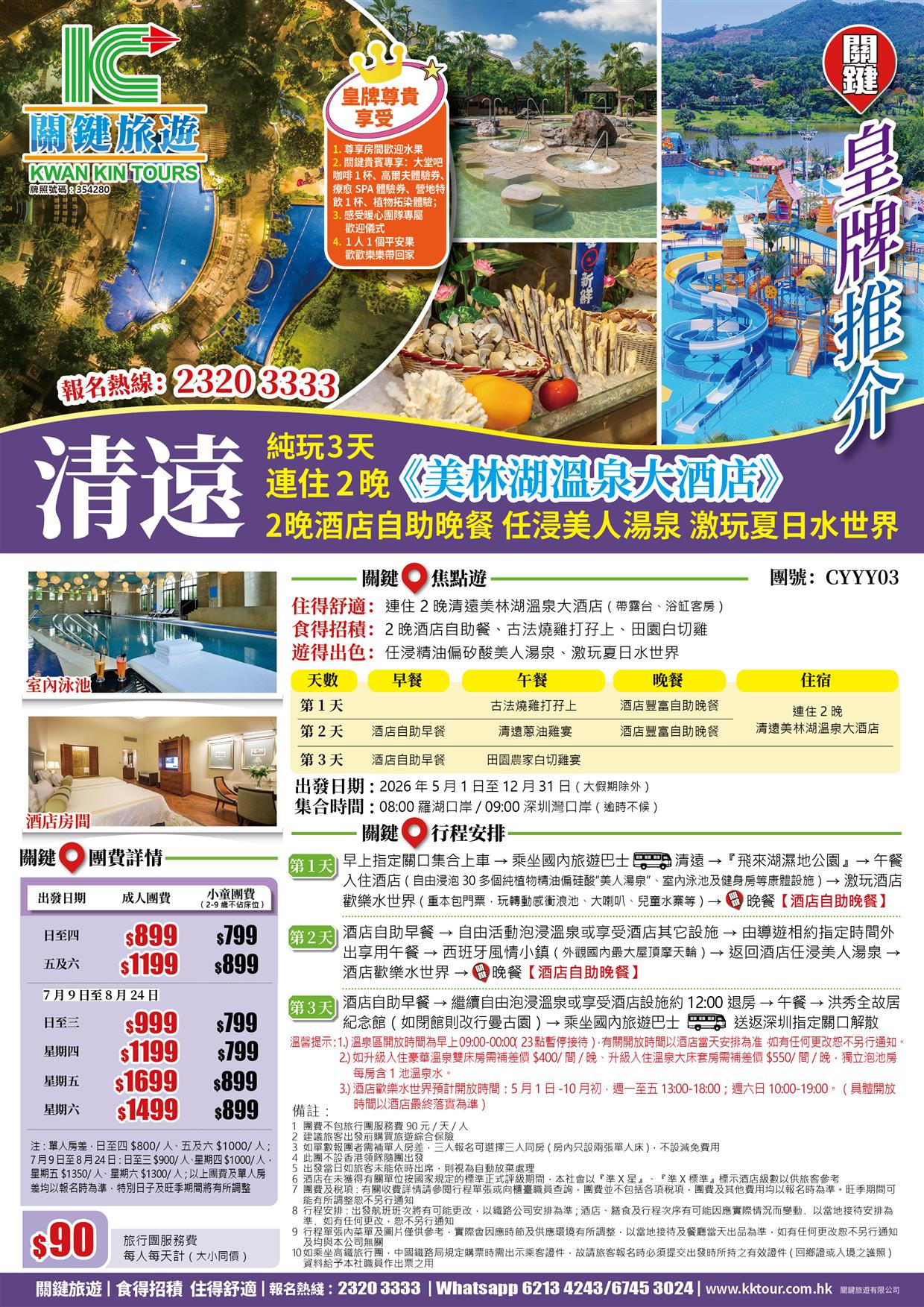 連住2晚《清遠美林湖溫泉大酒店》 激玩夏日水世界 任浸美人湯泉 歎酒店自助餐 純玩3天