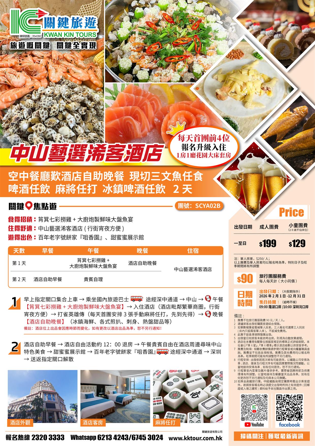 B線-中山藝選浠客酒店 空中餐廳歎酒店自助晚餐(現切三文魚任食、冰鎮啤酒任飲)麻將任打2天
