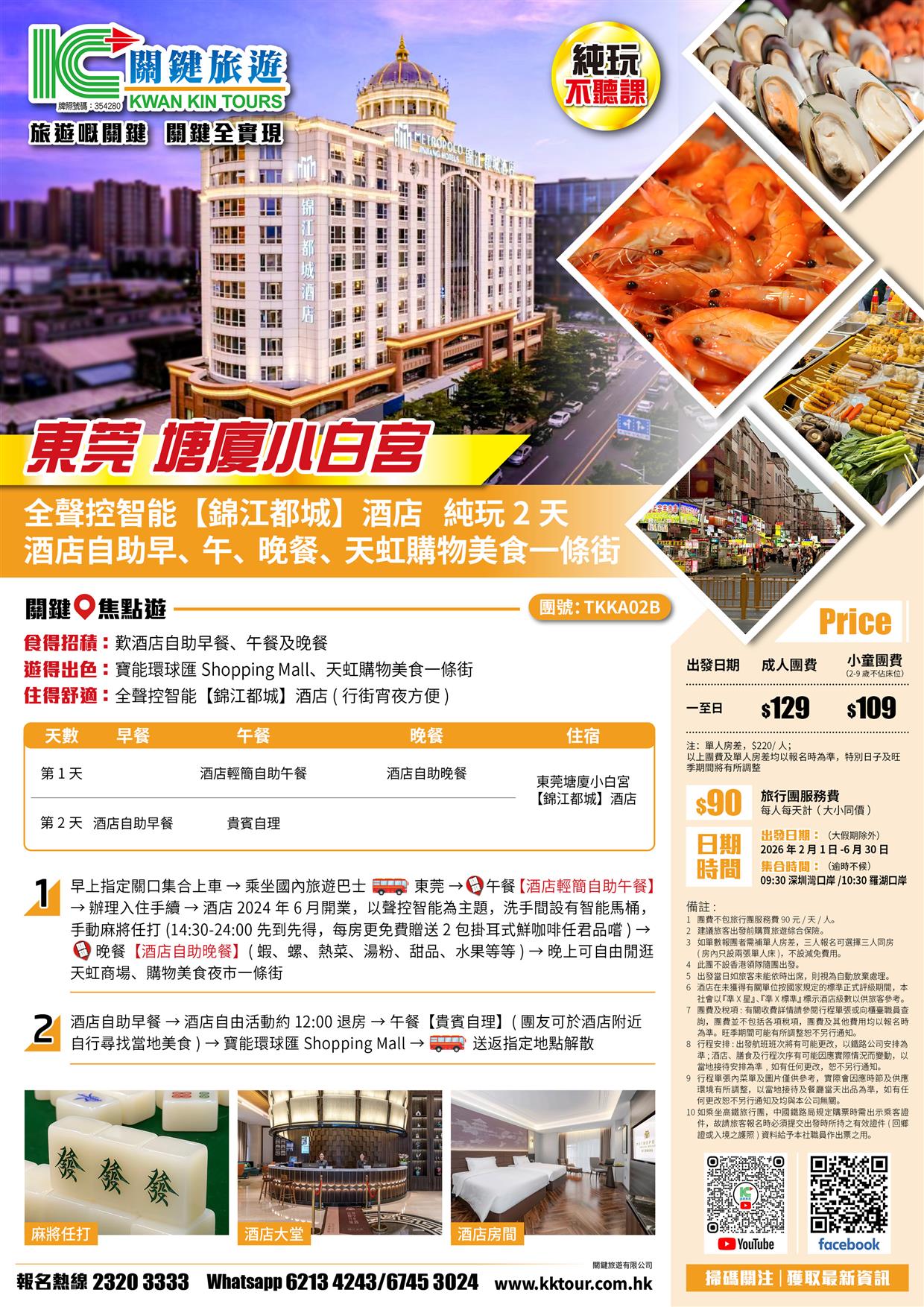 B線-東莞塘廈小白宮~全聲控智能【錦江都城】酒店(自助早、午、晚餐)純玩2天