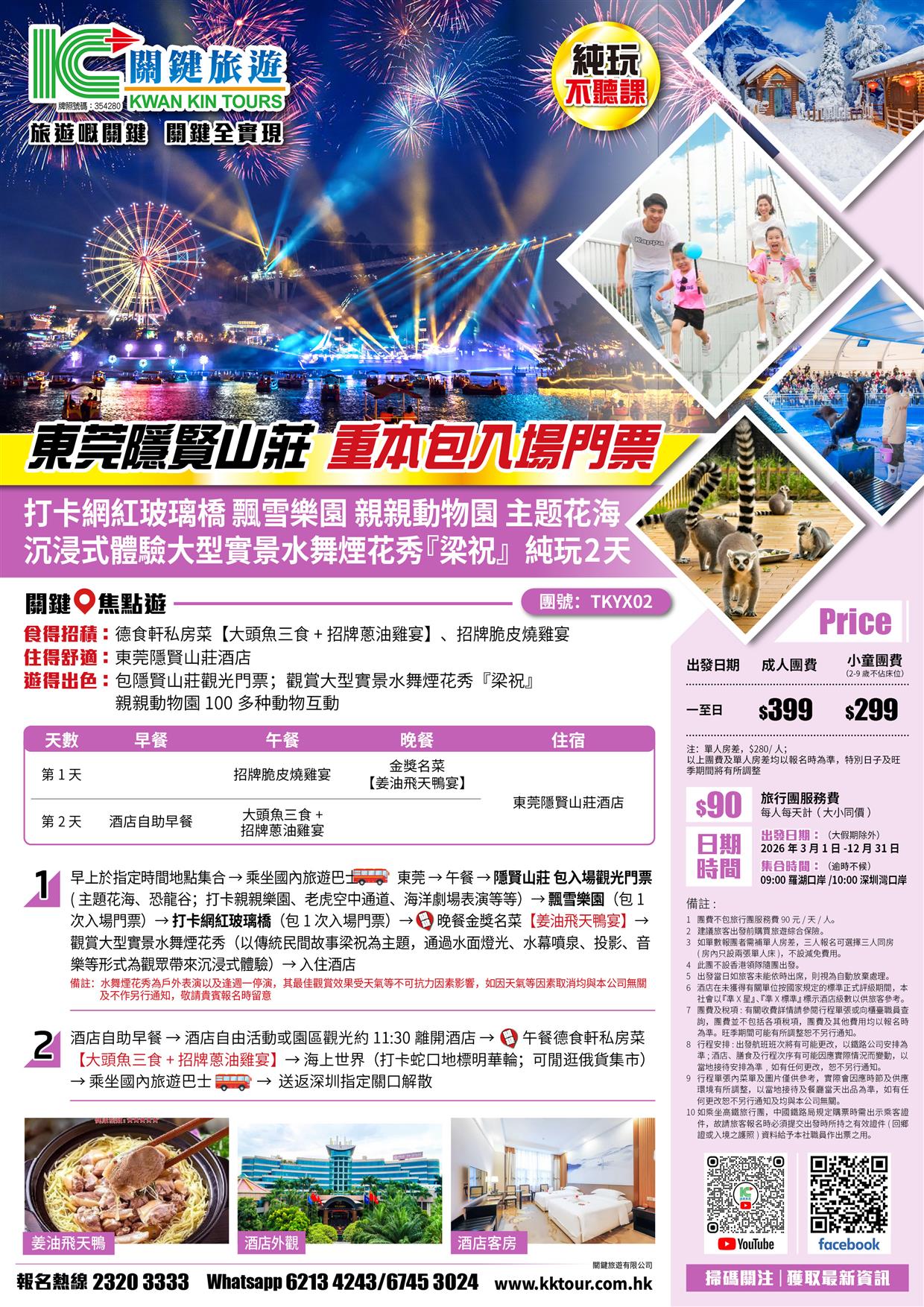 東莞隱賢山莊酒店、重本包門票打卡網紅玻璃橋、動物園、冰雪世界、觀賞實景水舞煙花秀梁祝純玩2天