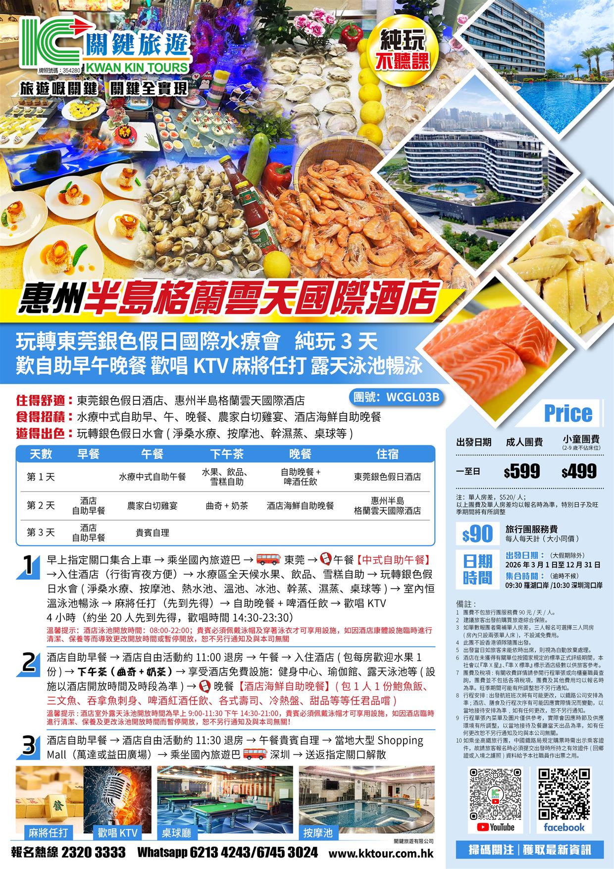 B線-惠州半島格蘭雲天國際酒店 玩轉東莞銀色假日國際水療會 歡唱KTV 麻將任打 純玩3天