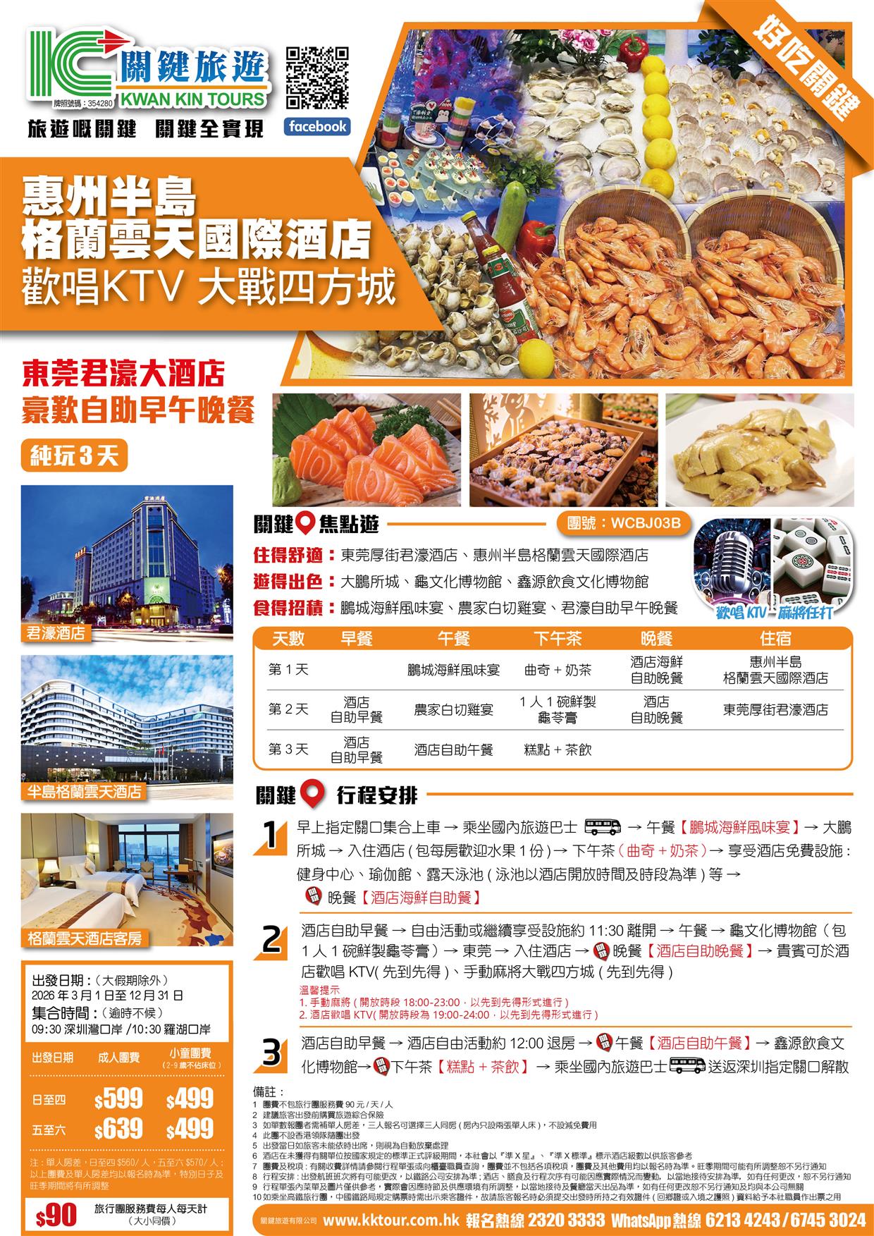B線-惠州半島格蘭雲天國際酒店+東莞君濠大酒店 歡唱KTV/大戰四方城 歎酒店自助餐 純玩3天