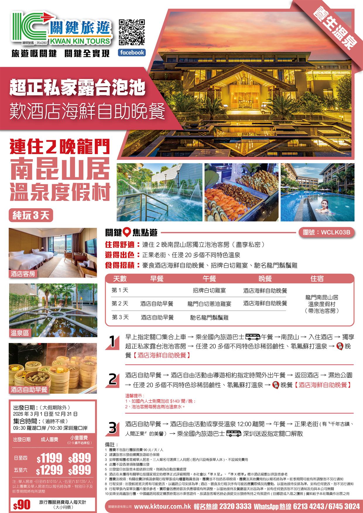 B線-連住2晚【龍門南昆山居溫泉度假村】歎酒店自助晚餐 私家露台泡池房 純玩3天