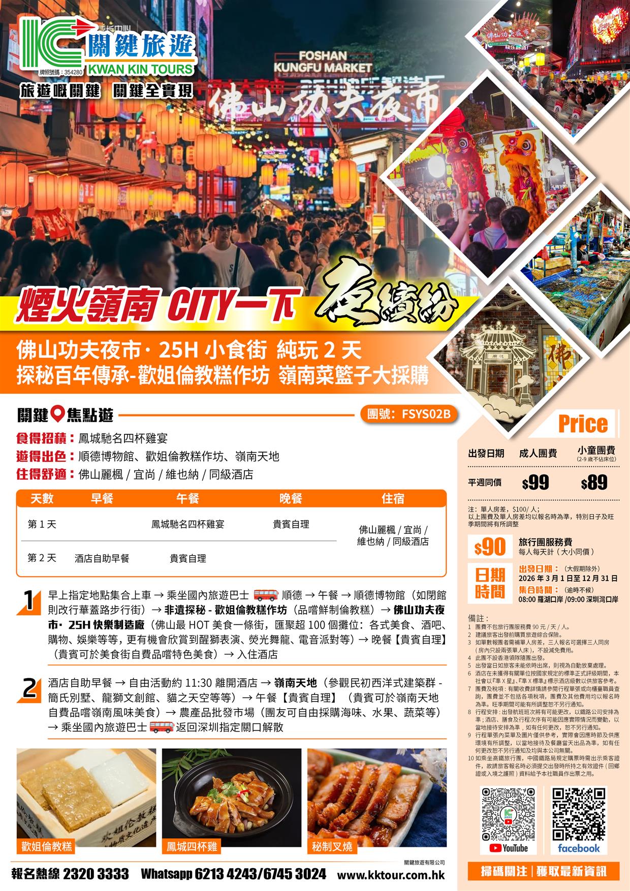 B線-煙火嶺南 佛山功夫夜市 25H小食街 歡姐倫教糕作坊 嶺南菜籃子大採購 純玩2天