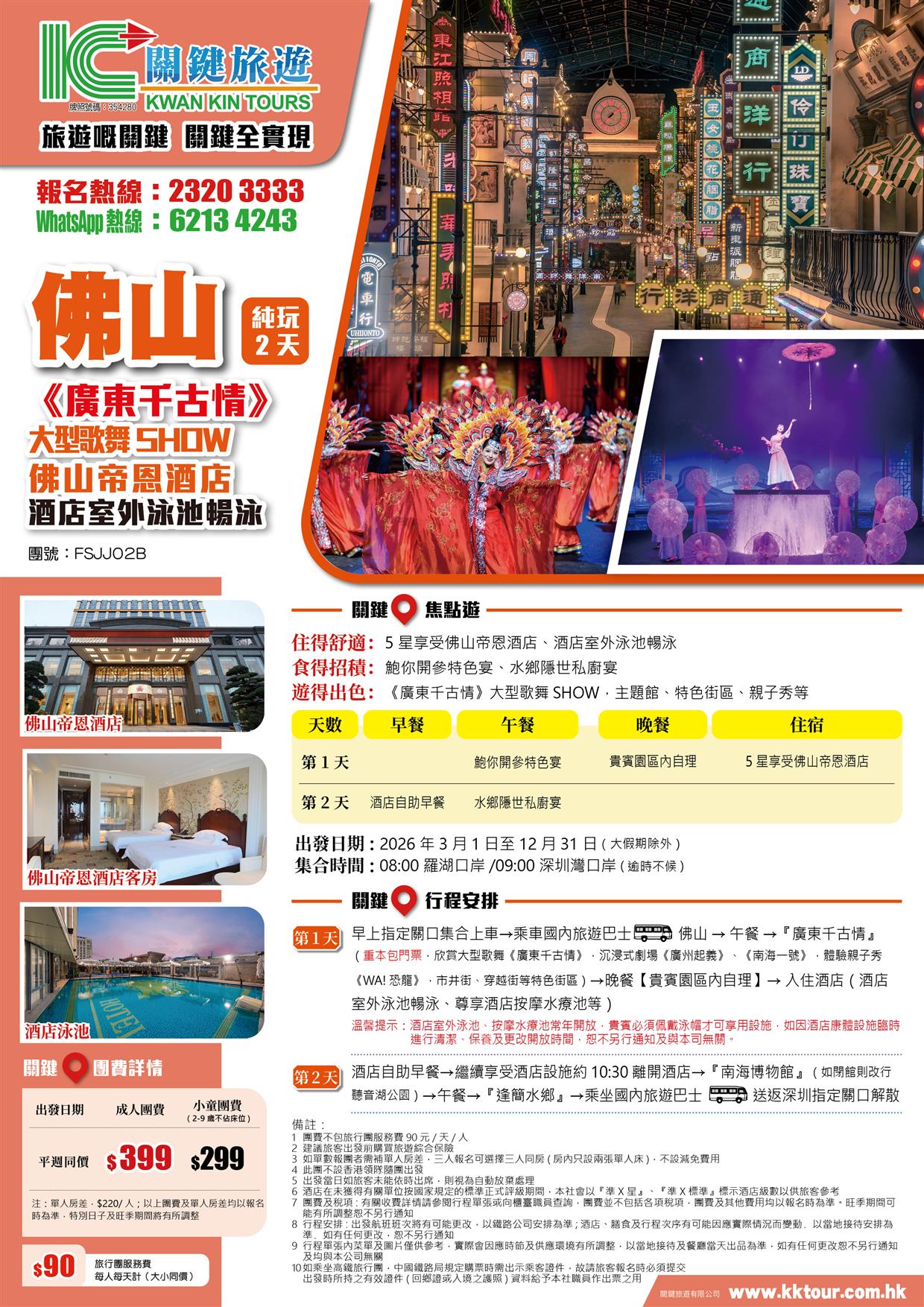B線-《廣東千古情》歌舞SHOW 佛山帝恩酒店 酒店室外泳池暢泳 暢玩按摩池 純玩2天