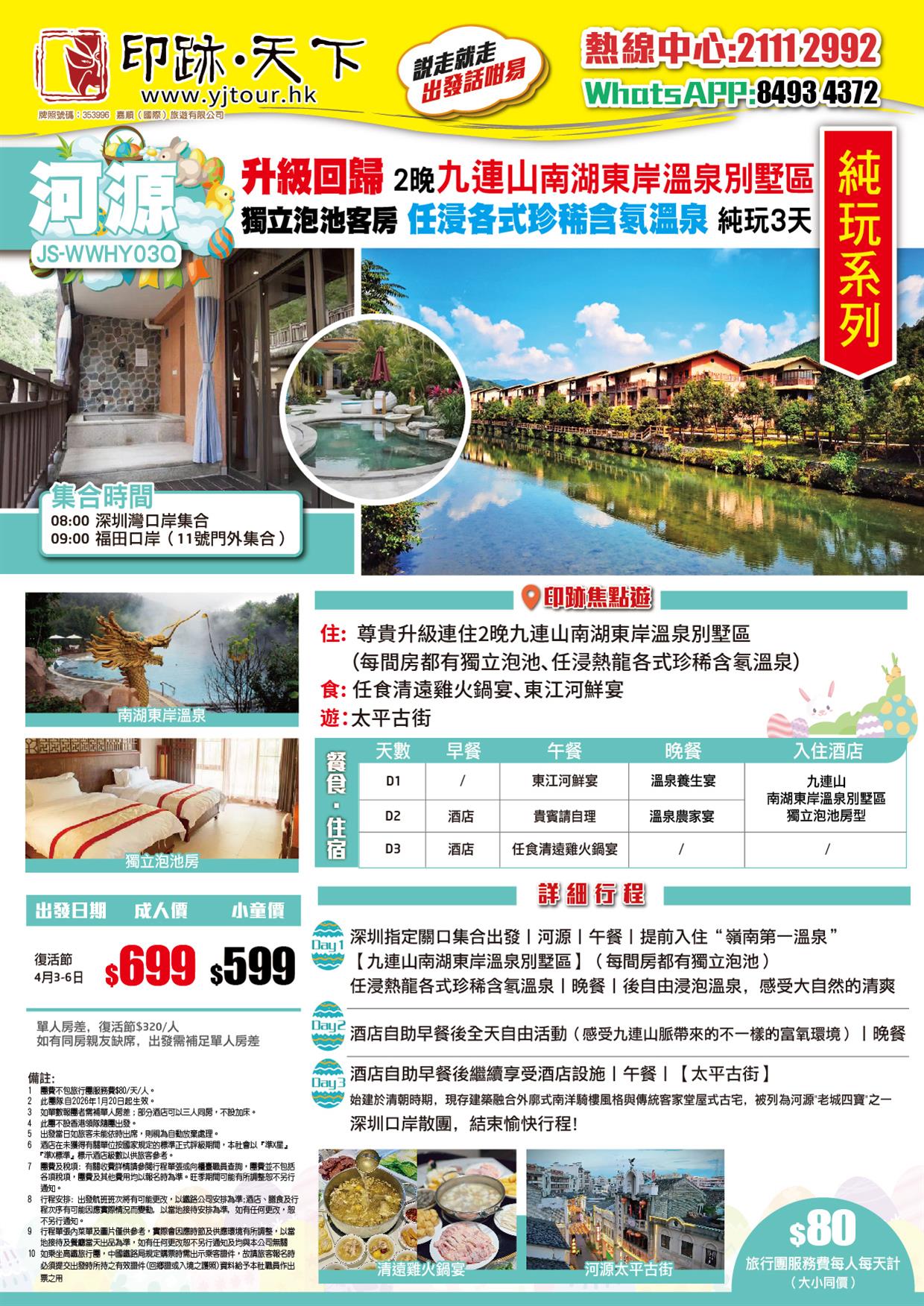 複活節加班 純玩 升級回歸連住兩晚九連山南湖東岸溫泉別墅區(每間房都有獨立泡池)任浸各式珍稀溫泉3天