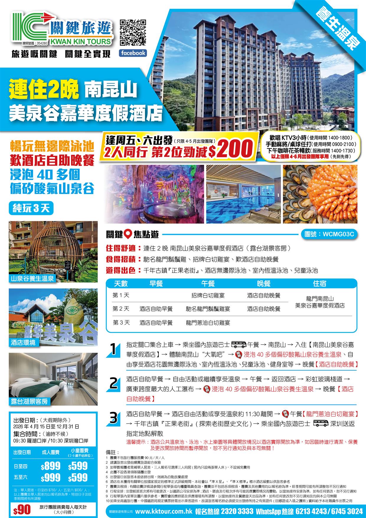 C線-連住2晚【南昆山美泉谷嘉華度假酒店】 歎酒店自助晚餐 任浸山泉谷養生溫泉 純玩3天