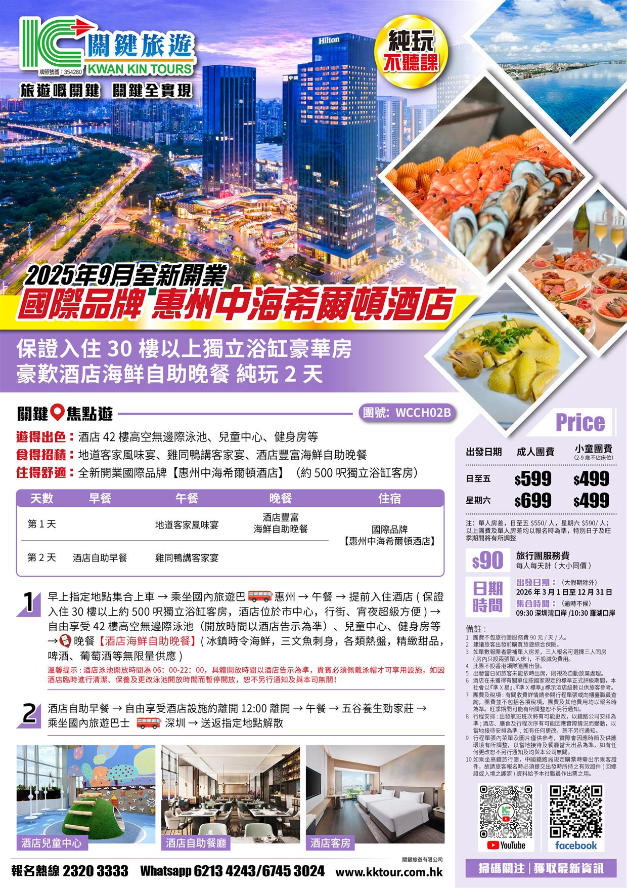B線-國際品牌【惠州中海希爾頓酒店】豪歎酒店海鲜自助晚餐 保證入住30樓以上獨立浴缸豪華房 純玩2天