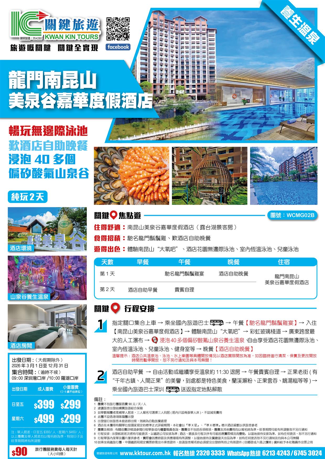 B線-龍門南昆山美泉谷嘉華度假酒店(歎酒店自助晚餐)任浸山泉谷養生溫泉 純玩2天