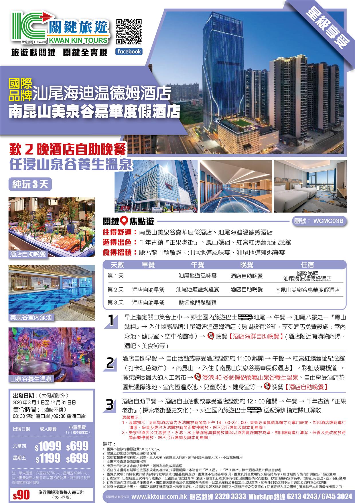B線-汕尾海迪溫德姆酒店+南昆山美泉谷嘉華度假酒店 歎2晚酒店自助晚餐 任浸山泉谷養生溫泉 純玩3天