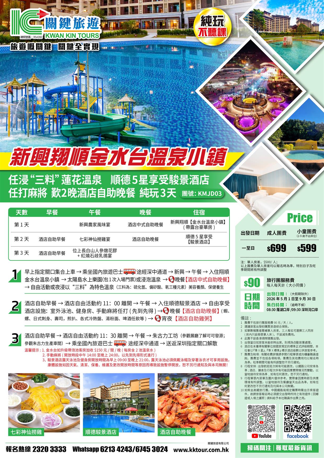 順德駿景酒店、新興翔順金水台溫泉小鎮(太陽島水上樂園、三料蓮花溫泉)、歎2晚酒店自助晚餐純玩3天