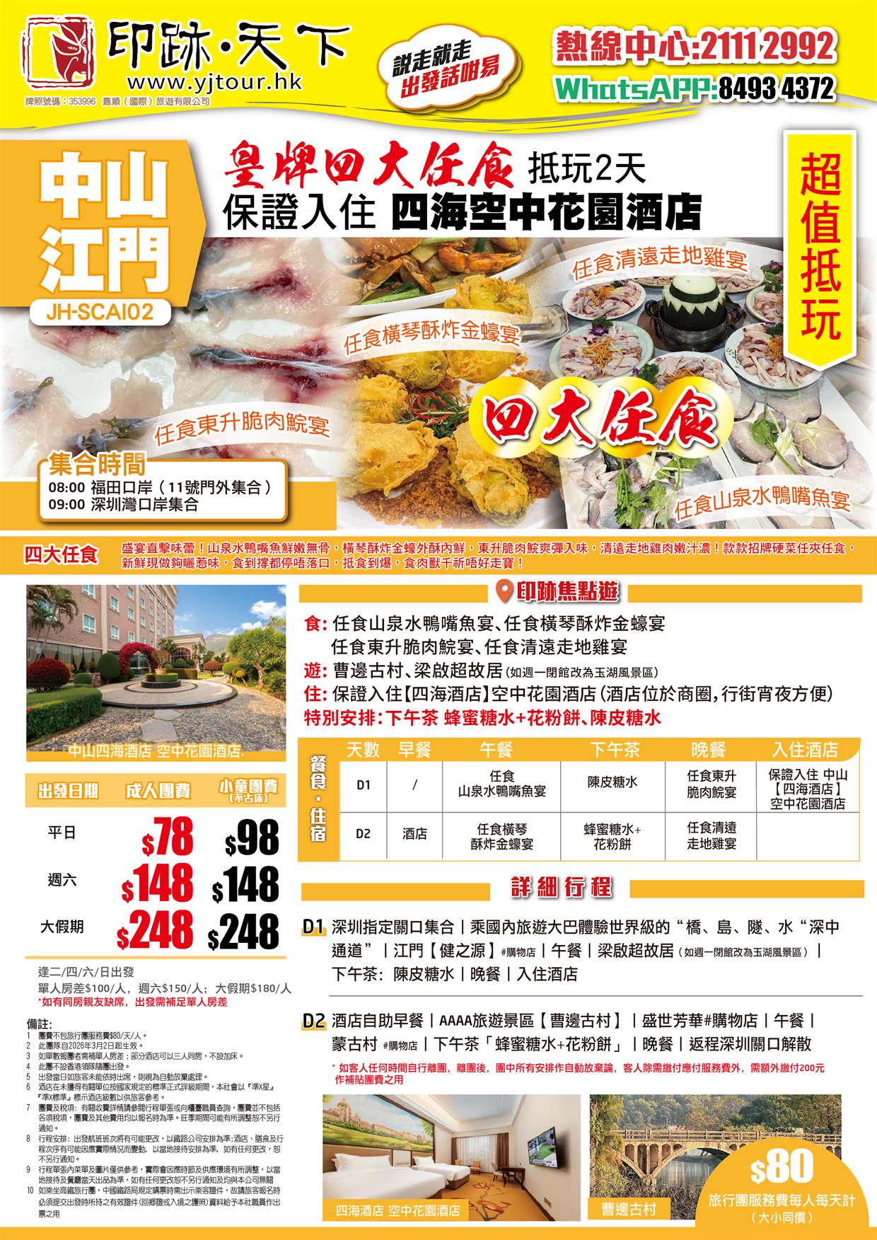 中山江門 【美食團】 皇牌四大任食 保證入住 四海空中花園酒店 抵玩2天