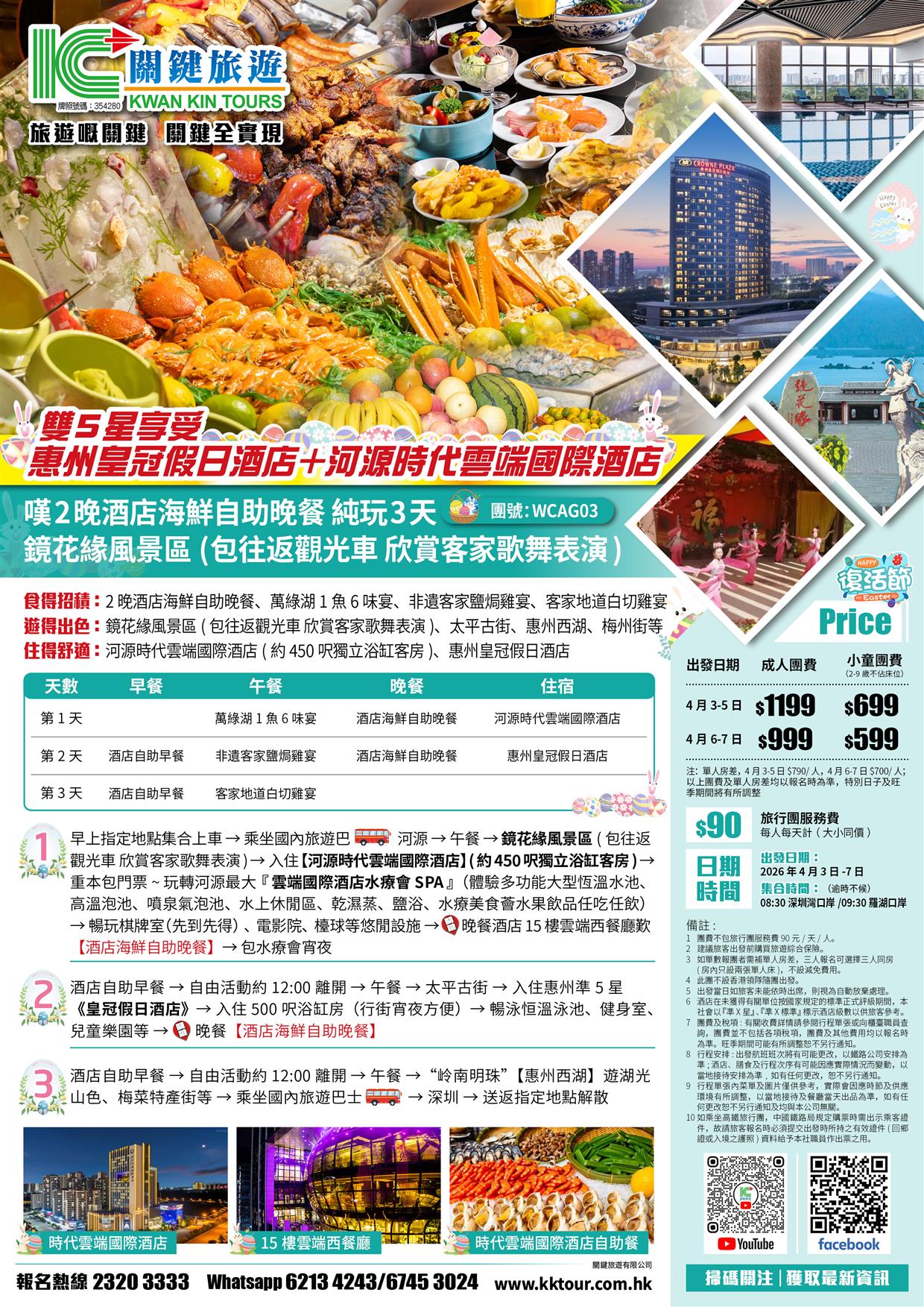 (復活加班)惠州皇冠假日酒店+河源時代雲端國際酒店 嘆2晚海鮮自助晚餐 鏡花緣客家歌舞表演 純玩3天