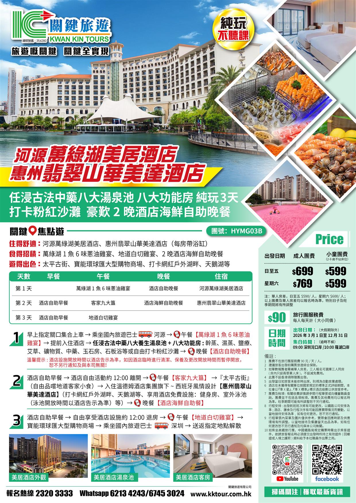 B線-河源萬綠湖美居酒店+惠州翡翠山華美達酒店 豪歎2晚酒店海鮮自助晚餐 任浸古法中藥湯泉純玩3天