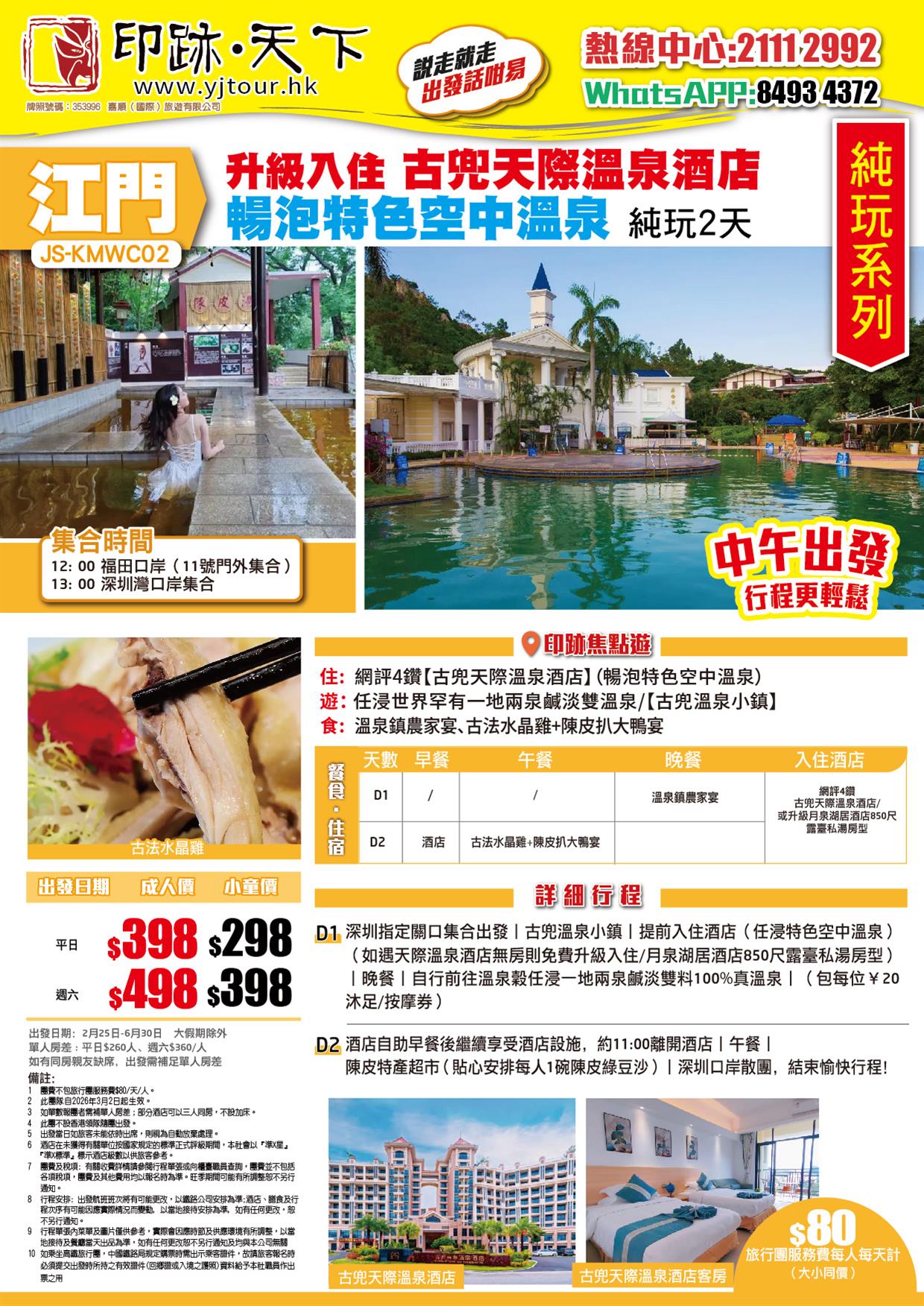 江門 升級入住網評四鑽【古兜天際溫泉酒店】(暢泡特色空中溫泉)古法水晶雞+陳皮扒大鴨宴純玩2天