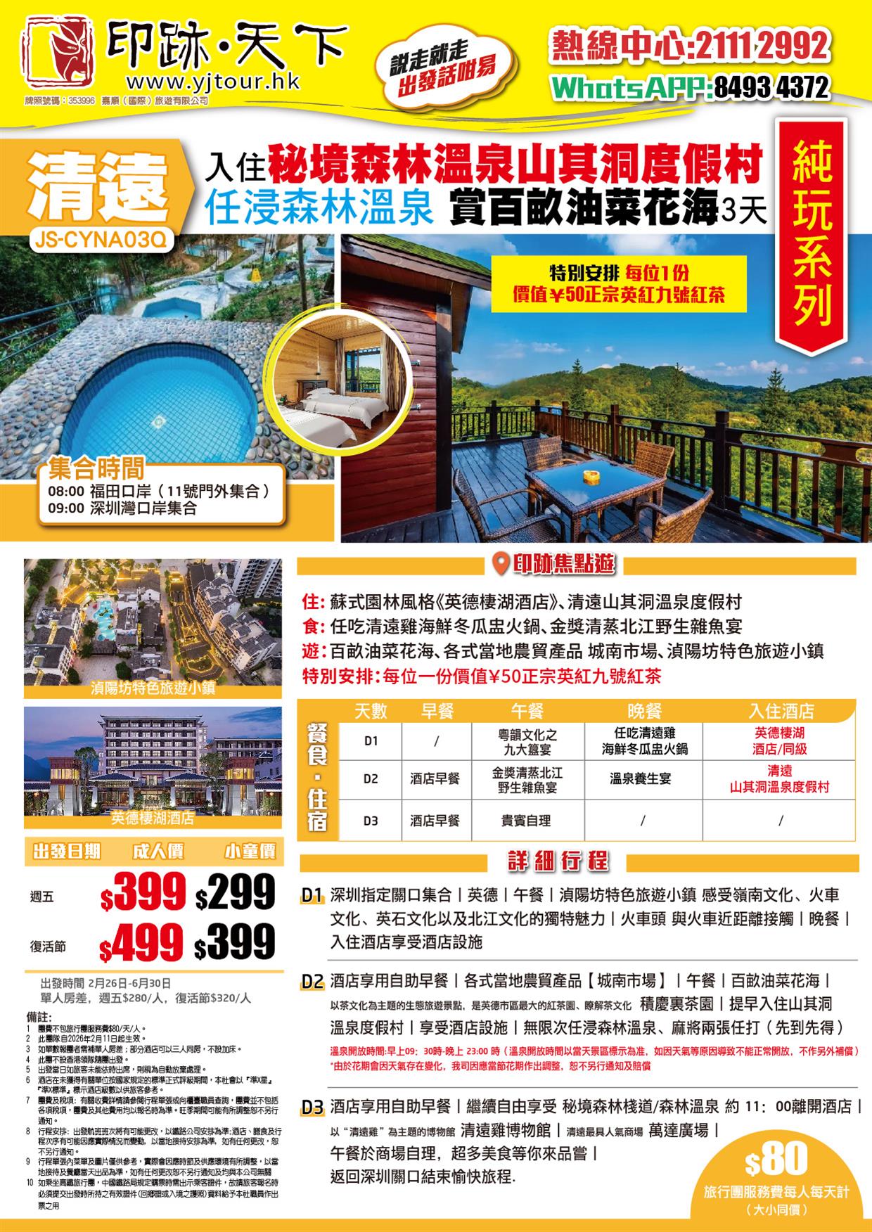 清遠 賞油菜花海 秘境森林溫泉山其洞度假村 任浸深山特色森林泡泉 任吃清遠雞海鮮冬瓜盅火鍋 純玩3天