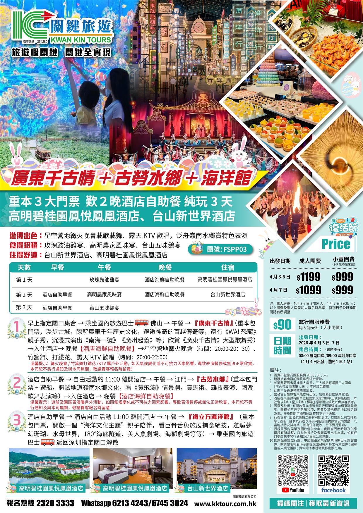 (復活加班)廣東千古情+古勞水鄉+海洋館 台山新世界酒店+高明碧桂園酒店 歎2晚酒店自助餐 純玩3天