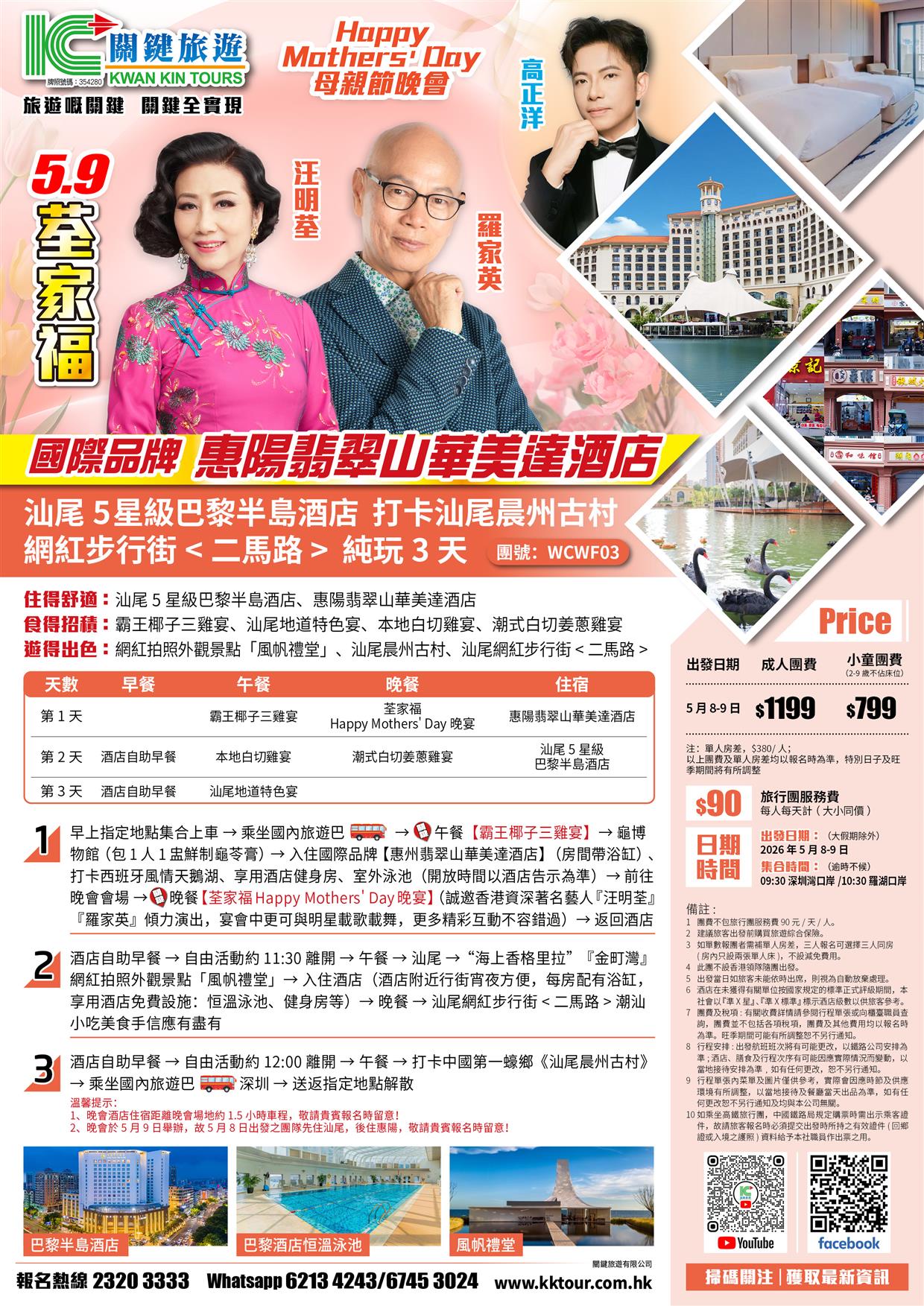 5.9荃家福Happy Mothers Day 惠陽翡翠山華美達酒店+汕尾巴黎半島酒店 純玩3天
