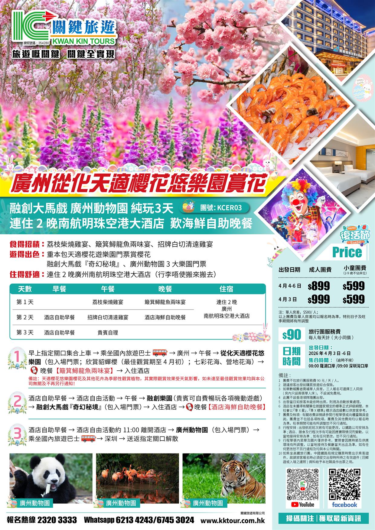(復活加班)連住2晚南航明珠空港大酒店、海鮮自助晚餐、天適櫻花悠樂園、融創大馬戲、廣州動物園純玩3天