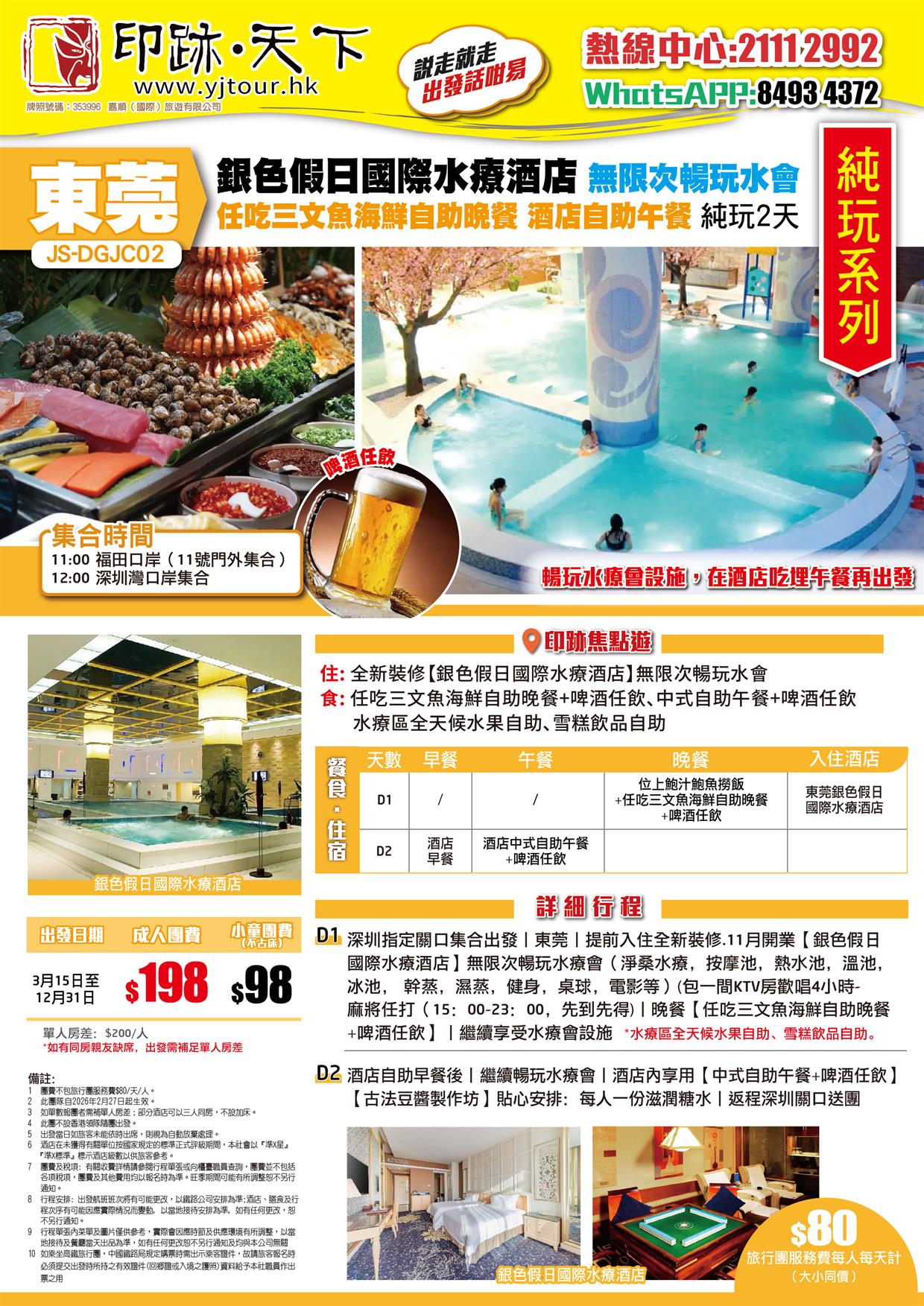 東莞 全新裝修【銀色假日國際水療酒店】無限次暢玩水會 任吃三文魚海鮮自助晚餐 中式自助午餐 純玩2天