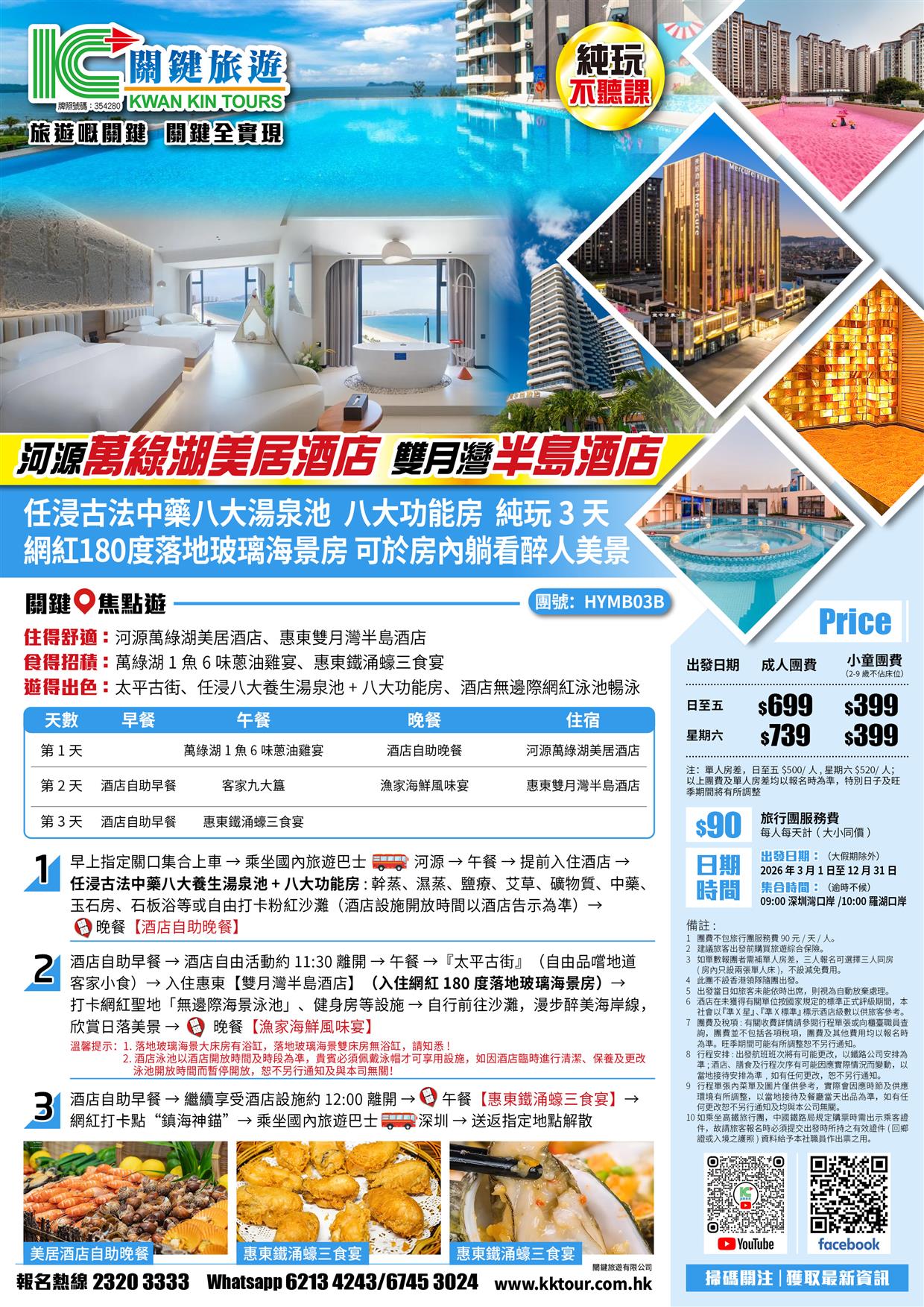 雙月灣半島酒店(網紅180度落地玻璃海景房)+河源萬綠湖美居酒店(任浸古法中藥湯泉池)純玩3天