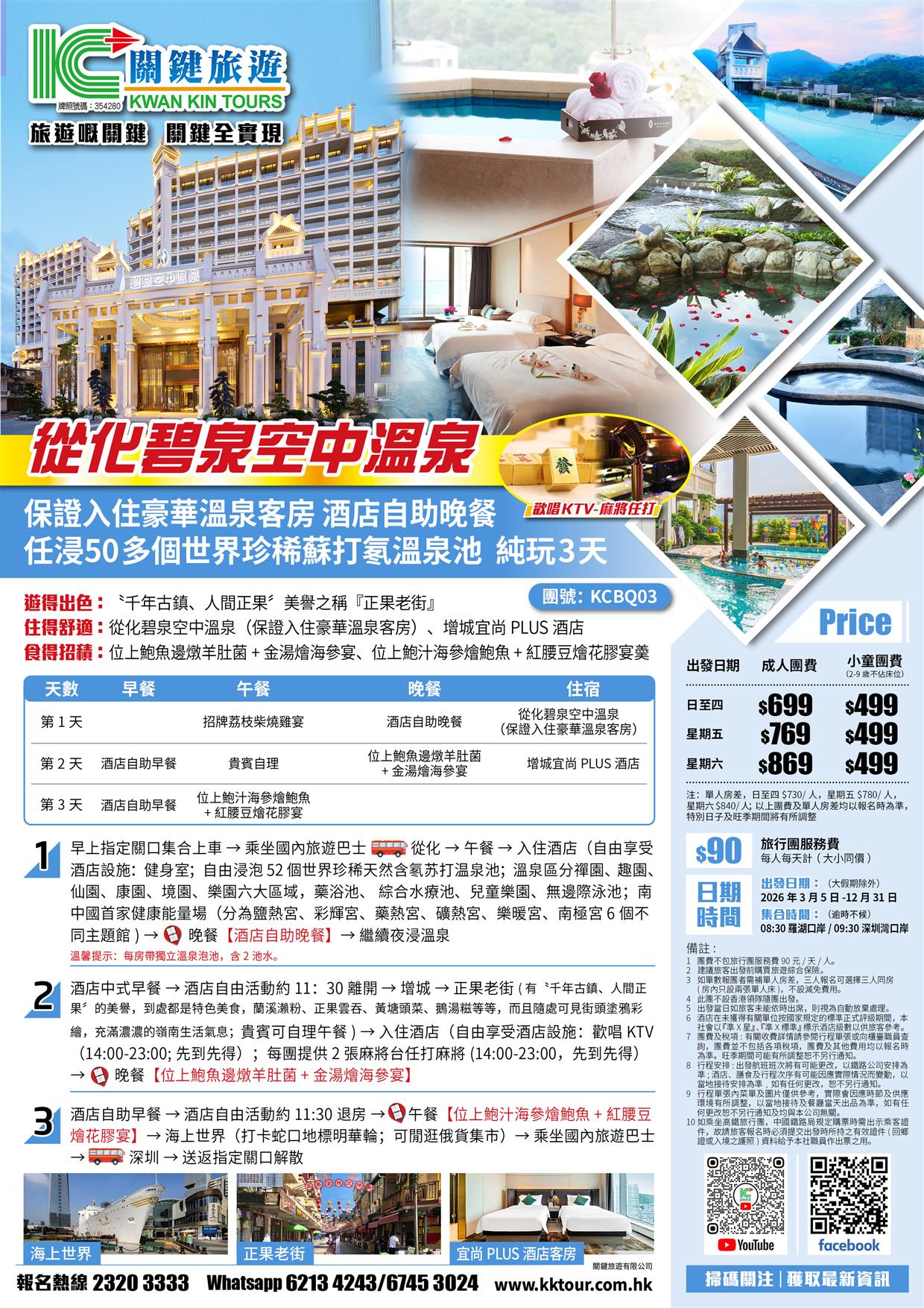 從化碧泉空中溫泉(入住豪華溫泉客房)、任浸世界珍稀蘇打氡溫泉、增城宜尚PLUS酒店純玩3天
