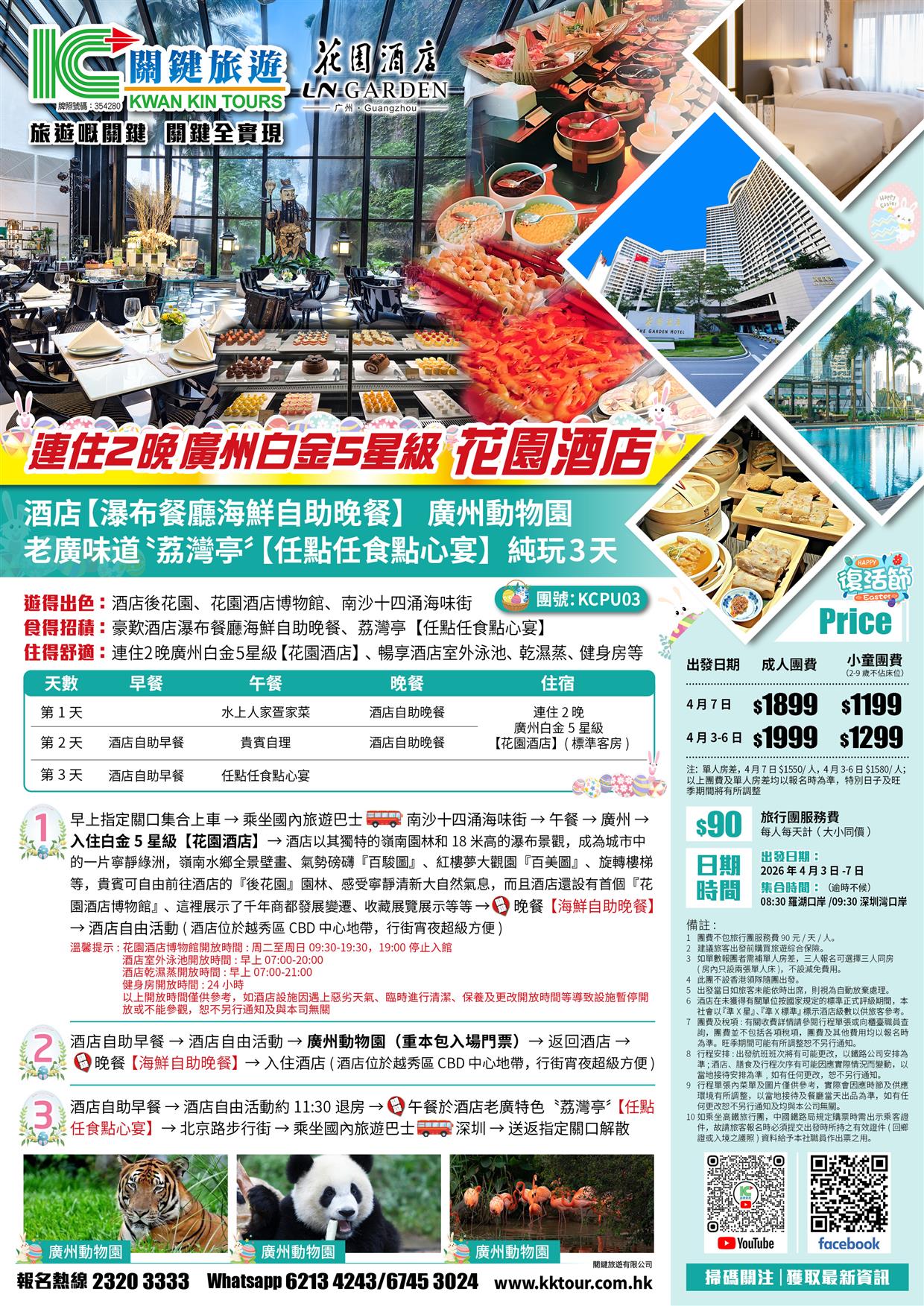 (復活加班)連住2晚廣州白金5星花園酒店、酒店【瀑布餐廳海鮮自助晚餐】、荔灣亭任點任食點心宴純玩3天