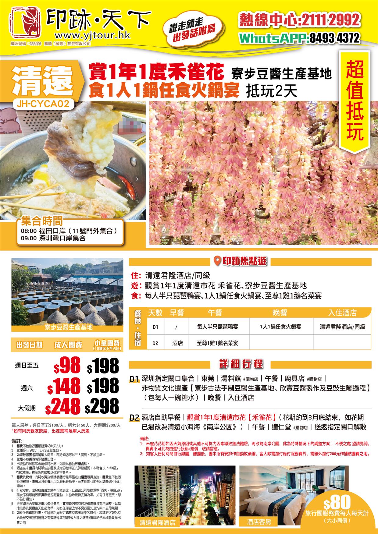 清遠 賞一年一度禾雀花 食1人1鍋任食火鍋宴 入住清遠君隆酒店/同級 抵玩2天