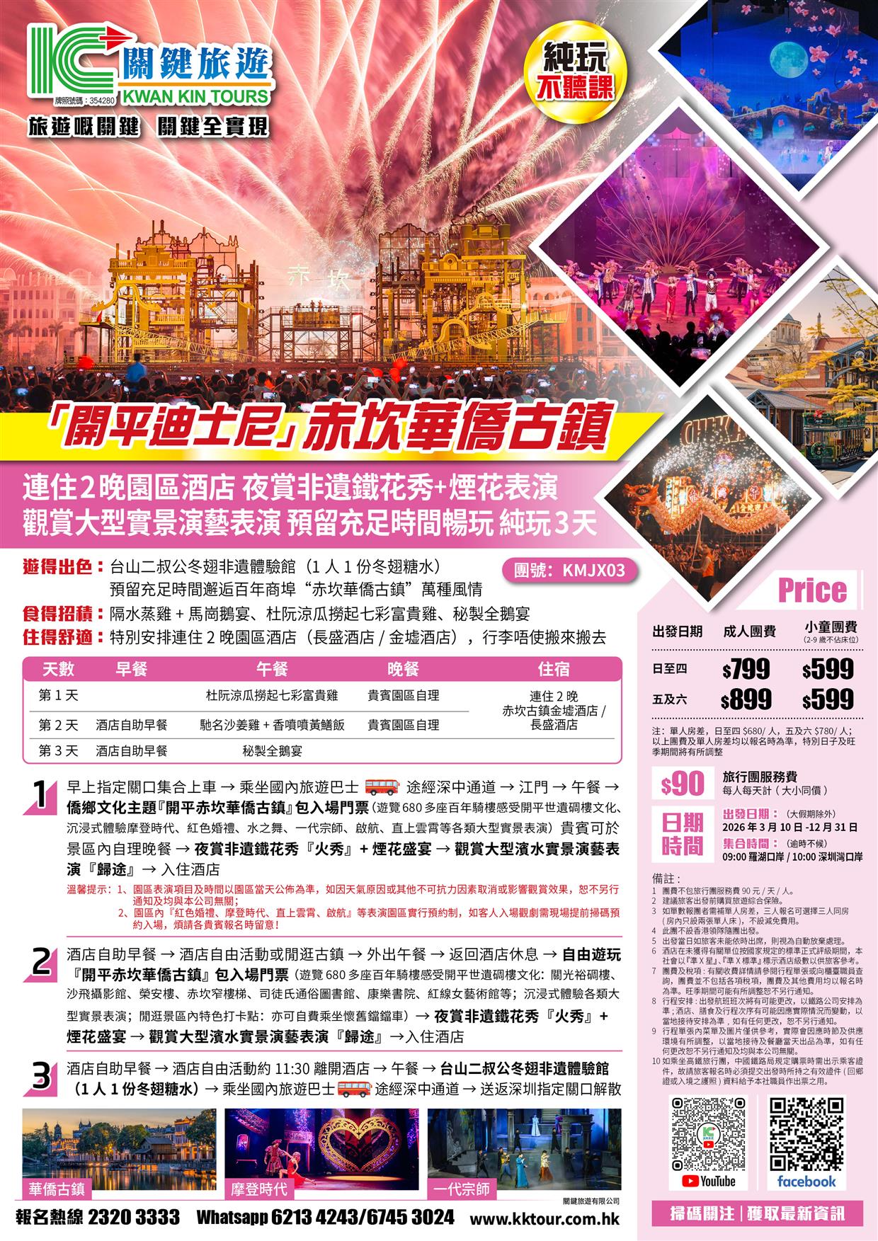 開平迪士尼 連住2晚開平赤坎古鎮園區酒店、夜賞非遺鐵花秀+煙花表演、觀賞大型實景演藝表演純玩3天