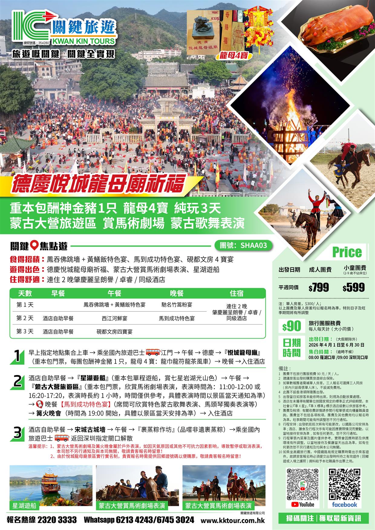 德慶悅城龍母廟祈福 包星湖遊船 蒙古大營旅遊區 賞馬術劇場、蒙古歌舞表演 純玩3天