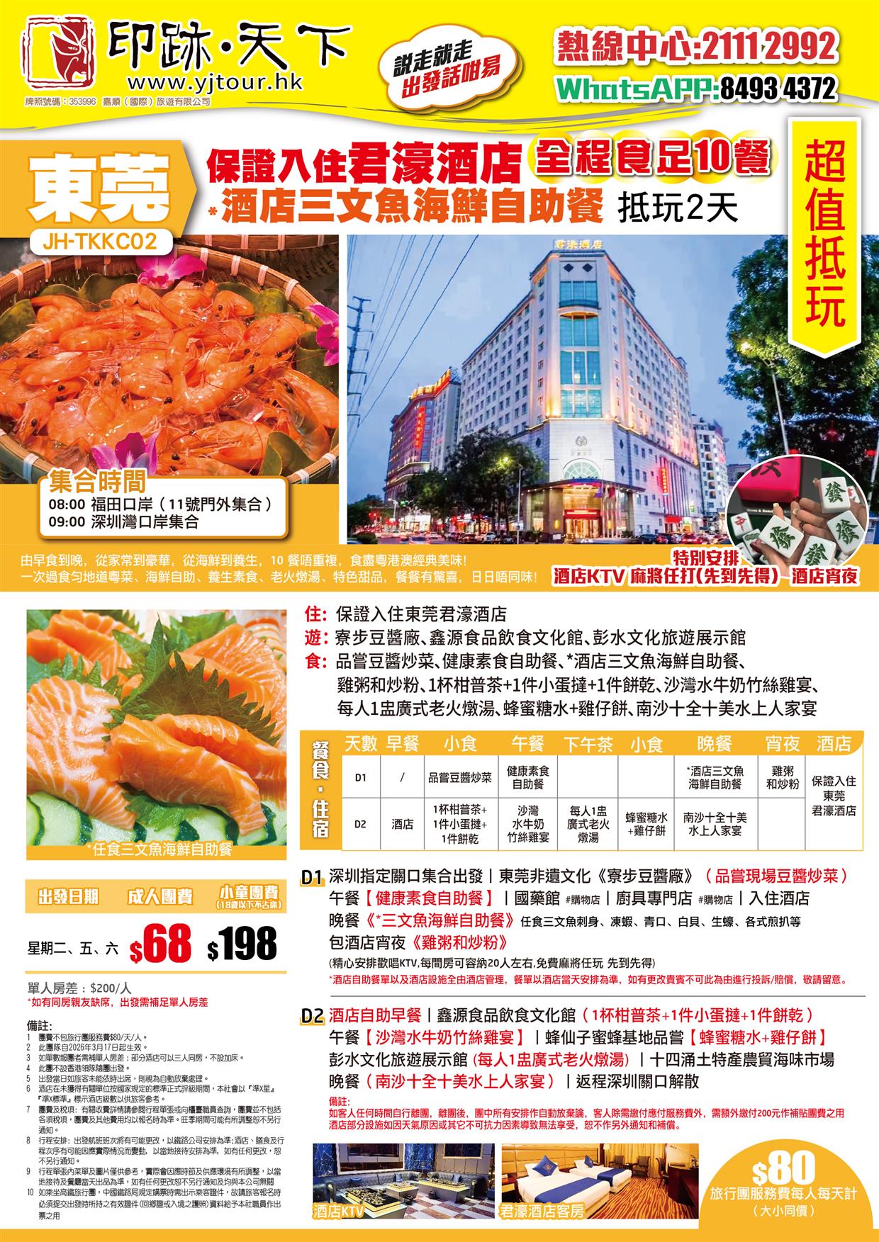 東莞 保證入住君濠酒店【酒店三文魚海鮮自助餐】全程食足10餐 抵玩2天