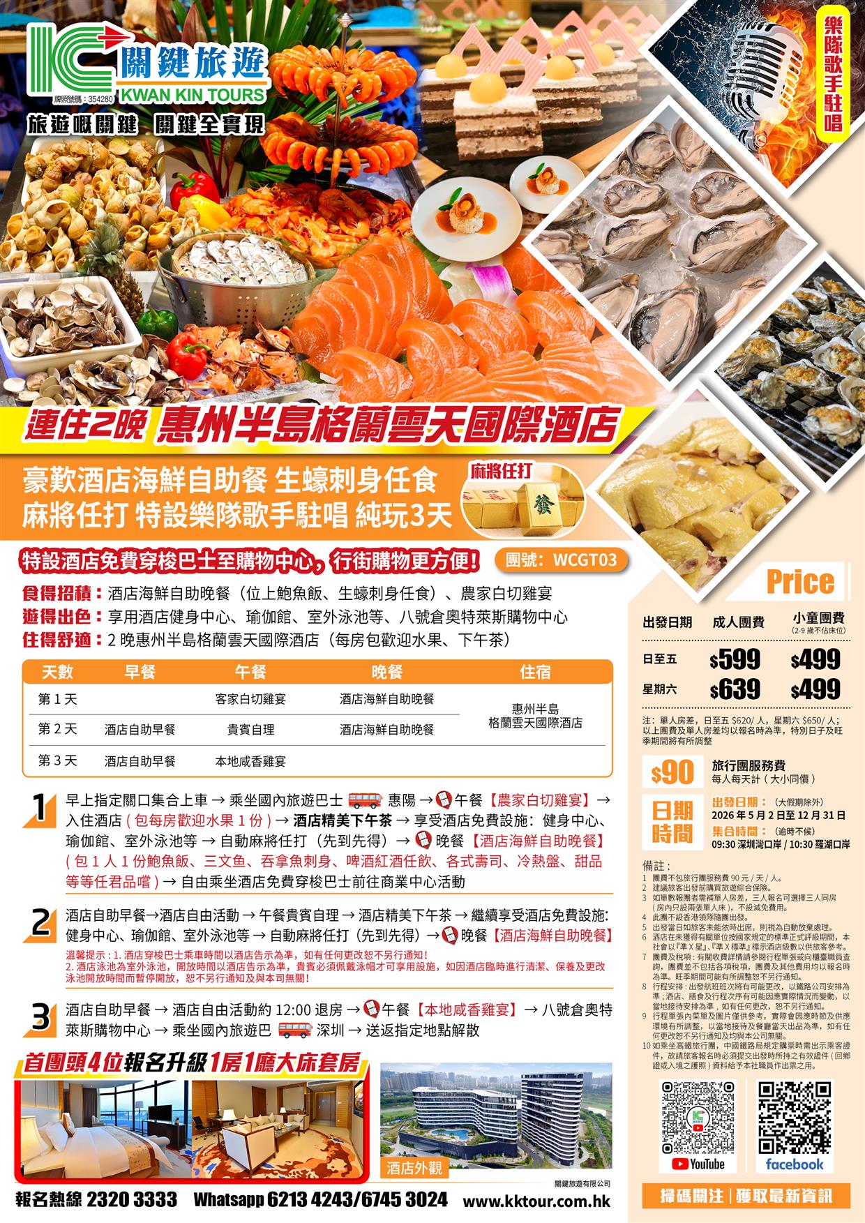 (頭4位升級大床套房)連住2晚 惠州半島格蘭雲天國際酒店 豪歎酒店海鮮自助餐 生蠔刺身任食 純玩3天