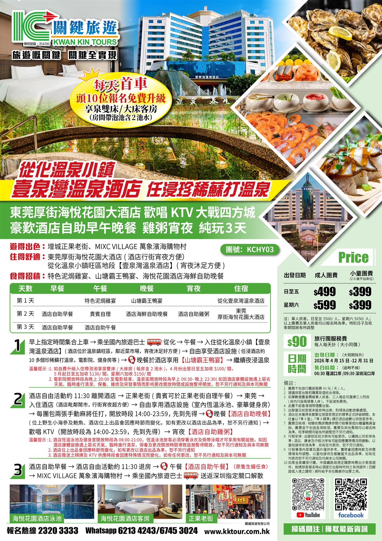 從化壹泉灣溫泉酒店 任浸珍稀蘇打溫泉、東莞厚街海悅花園大酒店 歎酒店自助早午晚餐、雞粥宵夜純玩3天